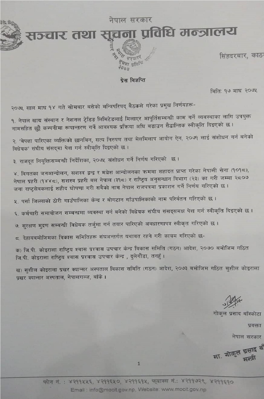हेर्नुहोस् माघ १४ गतेको मन्त्रिपरिषद बैठकका निर्णयहरु