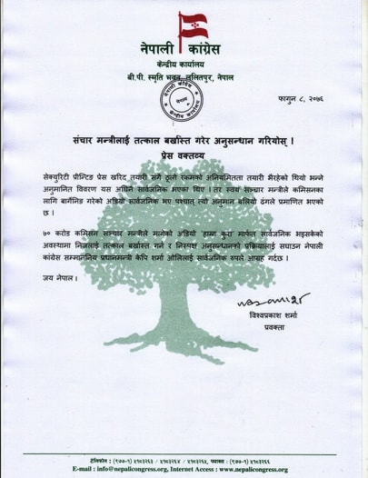 ‘‘सेक्यूरिटी प्रिन्टिङ प्रेस खरिद तयारीसँगै ठुलो रकमको अनियमितता तयारी भईरहेको थियो भन्ने अनुमानित बिवरण यस अघि नै सार्वजनिक भएका थिए,’’ वक्तव्यमा लेखिएको छ, ‘‘तर स्वयं सञ्चारमन्त्रीले कमिसनका लागि बार्गेनिङ गरेको अडियो सार्वजनिक भए पश्चात त्यो अनुमान बलियो ढङ्गले प्रमाणित भएको छ।’