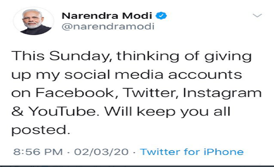 एजेन्सी– भारतीय प्रधानमन्त्री नरेन्द्र मोदीले सामाजिक सञ्जाल त्याग्ने निर्णय गरेसँगै भारतीय मिडियामा यसबारे बहस चलेको छ। मोदीले आउँदो आइतबारबाट सामाजिक सञ्जाल त्याग्ने बताएसँगै उनीबारे विभिन्न टिकाटिप्पणी हुन थालेको छ। मोदीले आइतबार साँझ ट्वीटमार्फत् सामाजिक सञ्जालको एकाउन्ट त्याग्ने जानकारी गराएका थिए।
