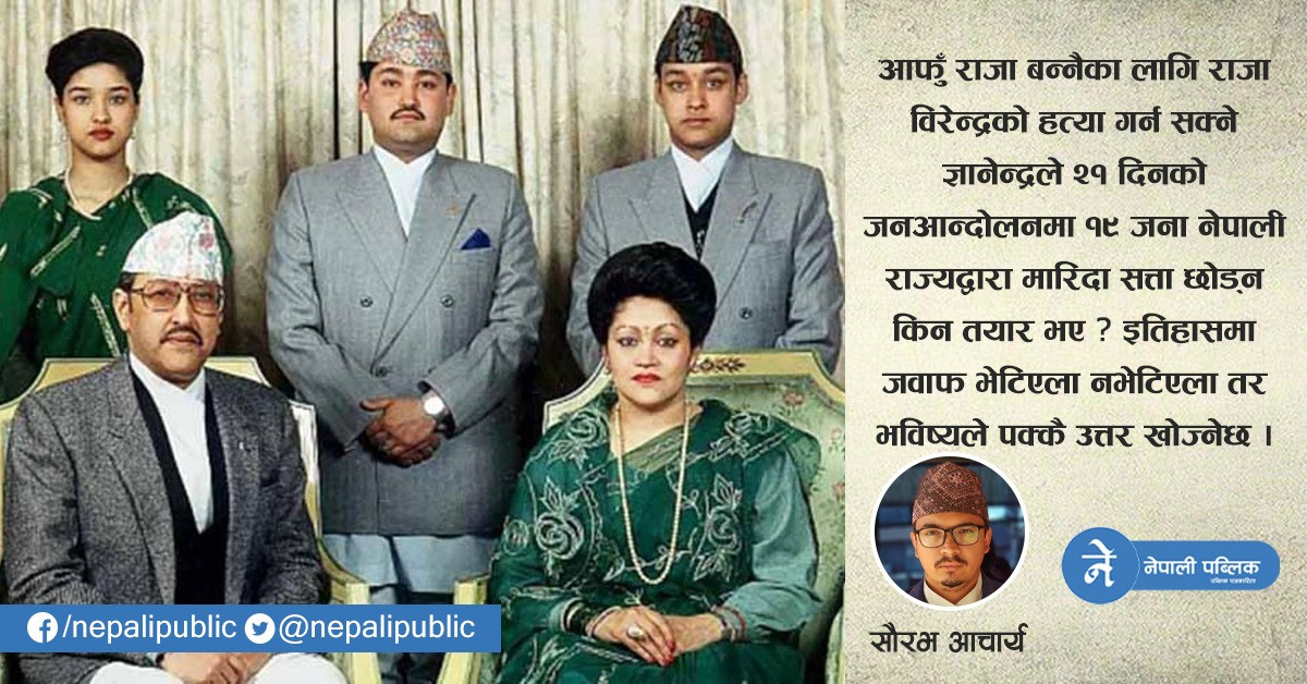राजा रहेकै अवस्थामा ज्ञानेन्द्रले राजा विरेन्द्र मारिएका नारायणहिटि दरवार भित्रको त्रिभुवन सदनको पुनःनिर्माण गर्नु र राजा विरेन्द्रको हत्याको साक्षी उक्त त्रिभुवन सदनलाई सदाको लागि अन्त्य गरिदिनु पछिको रहस्य पनि नेपाली इतिहासको महत्वपूर्ण दस्तावेज बन्न सक्छ, आशा गरौँ यदि केही डरकै कारणले पूर्व राजा ज्ञानेन्द्रले केहि तथ्यहरु राख्न सकिरहेका छैनन् भनेपनि कुनै समयमा उनले नेपाली जनतासमक्ष राख्ने नै छन्। ज्ञानेन्द्रलाई आफ्नै दाइ तथा नेपालीहरुको प्रिय राजा विरेन्द्रको हत्याको आरोप लागिरह्यो तर आफुँ राजा बन्नैका लागि राजा विरेन्द्रको हत्या गर्न सक्ने ज्ञानेन्द्रले २१ दिनको जनआन्दोलनमा १९ जना नेपाली राज्यद्वारा मारिदा सत्ता छोड्न किन तयार भए ? इतिहासमा जवाफ भेटिएला नभेटिएला तर भविष्यले पक्कै उत्तर खोज्नेछ ।