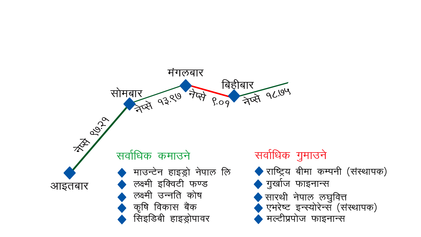 साताको पहिलो दिन आइतबार नेप्से परिसूचक ९७.२१ अङ्कले बढेर २९८०.६१ विन्दुमा पुगेको थियो । सो दिन दुई करोड ८८ लाख ६३ हजार ९३ कित्ता शेयर रु ११ अर्ब ६८ करोड ८१ लाख २६ हजार ४९२ मा कारोबार भयो । त्यस दिन १९४ वटा कम्पनीको शेयर मूल्य बढेको थियो भने २२ वटा कम्पनीको शेयर मूल्य ओरालो लाग्दा पाँचवटा कम्पनीको शेयर मूल्य स्थिर रहेको थियो ।