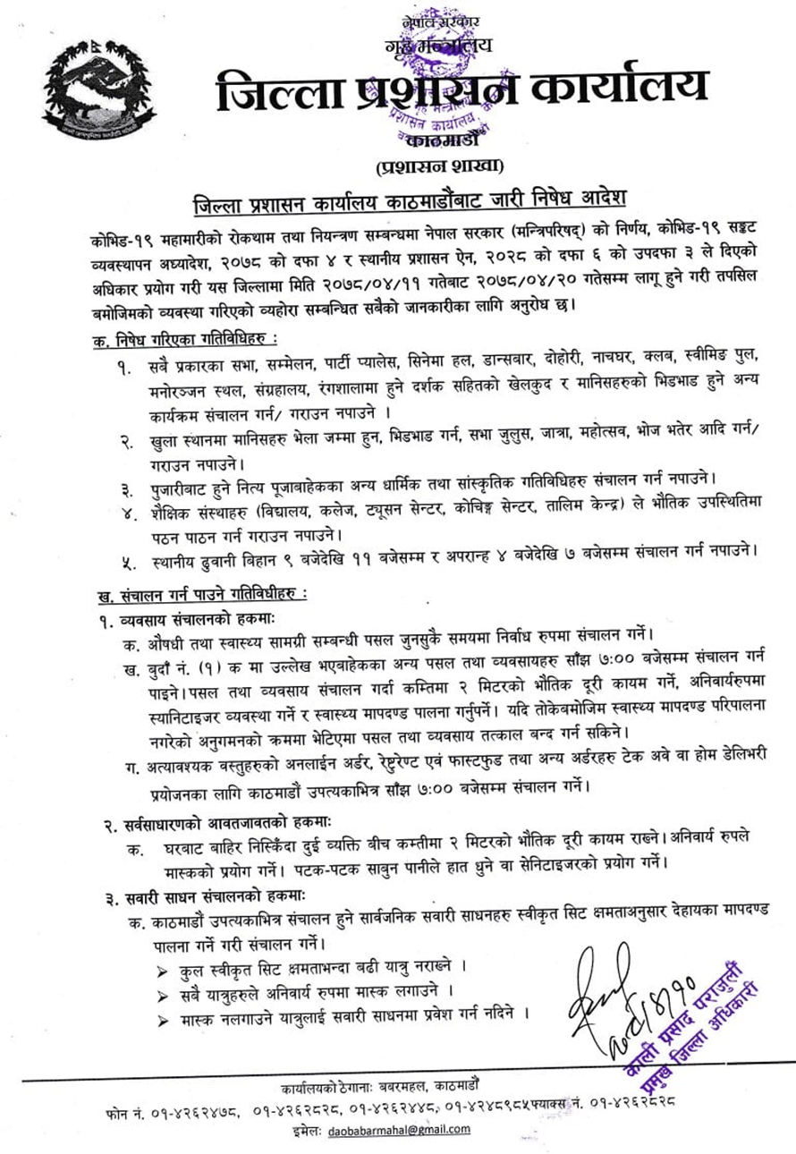 यसअघि जारी गरिएको निषेधाज्ञाको आदेशको अवधि आइतबार सकिएपछि काठमाडौं, ललितपुर र भक्तपुरका प्रमुख जिल्ला अधिकारीको बैठकले थप १० दिन निषेधाज्ञा थप गरेको हो।