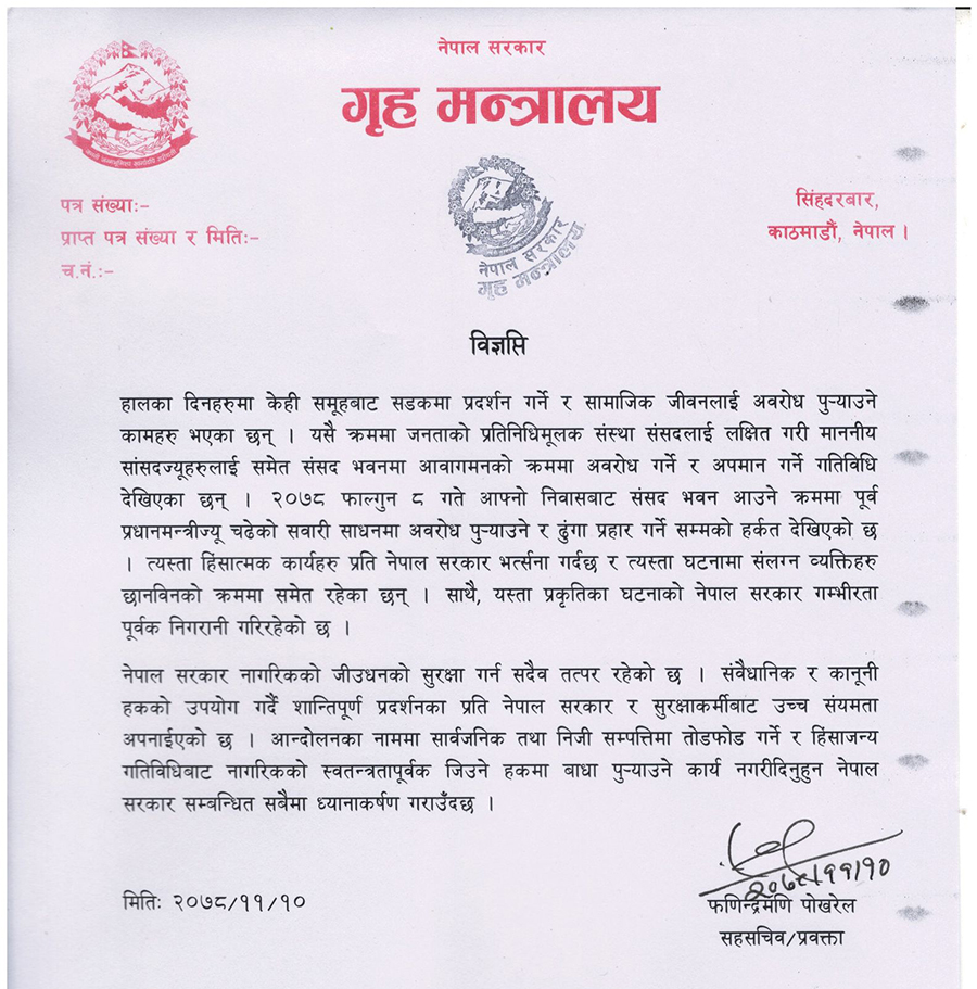 जनताको प्रतिनिधिमूलक संस्था संसद्लाई लक्षित गरी माननीय सांसदलाई समेत संसद् भवनमा आवागमनका क्रममा अवरोध गर्ने र अपमान गर्ने गतिविधि देखिएको मन्त्रालयले जनाएको छ । सरकार नागरिकको जीउधनको सुरक्षा गर्न सदैव तत्पर रहेको तथा संवैधानिक र कानूनी हकको उपयोग गर्दै शान्तिपूर्ण प्रदर्शनप्रति सरकार र सुरक्षाकर्मीबाट उच्च संयमता अपनाइएको विज्ञप्तिमा जनाइएको छ ।