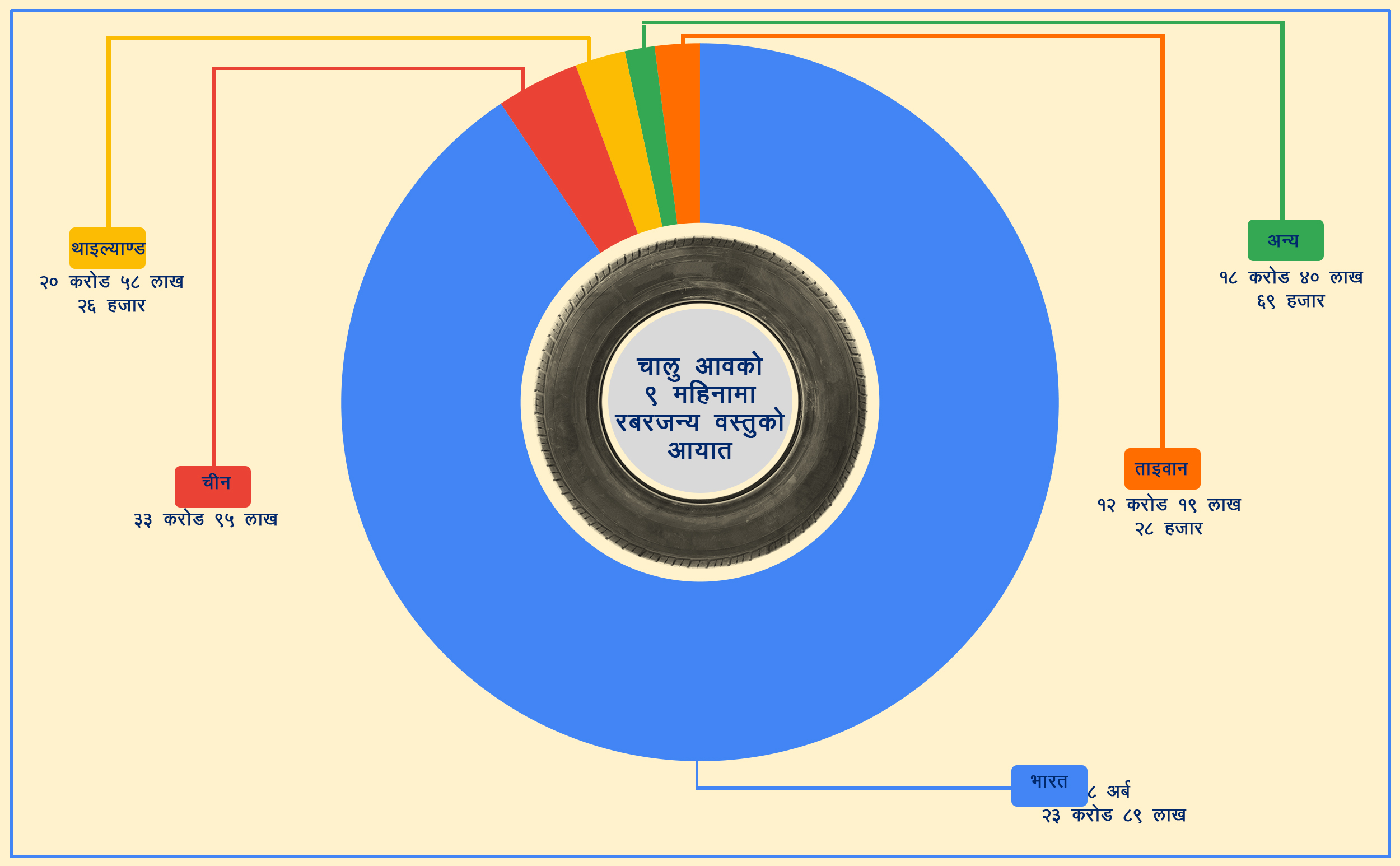 विभागको तथ्याङ्कानुसार नौ महिनामा सबैभन्दा बढी टायर र ट्युब भारतबाट आयात भएको देखिन्छ । विवरणानुसार चालु आवको चैत मसान्तसम्म भारतबाट मात्र ४४ लाख ४१ हजारभन्दा धेरै थान तथा १७ लाख ४८ हजार रबरजन्य वस्तु आयात भएको देखिन्छ । यसको आयात मूल्य रु आठ अर्ब २३ करोड ८९ लाखभन्दा धेरै छ । आयातबाट सरकारले रु दुई अर्ब ८० करोड ६३ लाखभन्दा बढी राजस्व उठाएको देखिन्छ ।