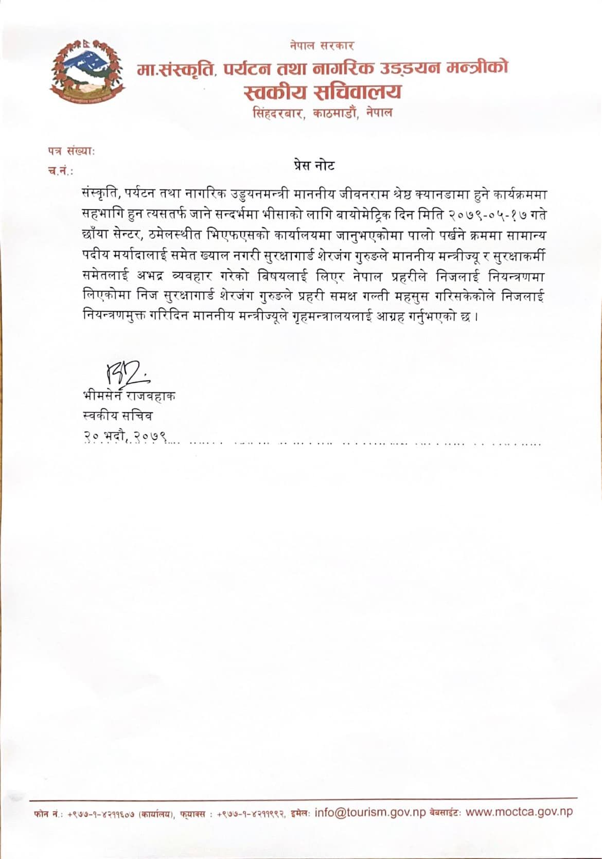 पर्यटन मन्त्री श्रेष्ठलाई ‘लाइनमा बस्नुस्’ भन्ने सुरक्षा गार्ड पक्राउ