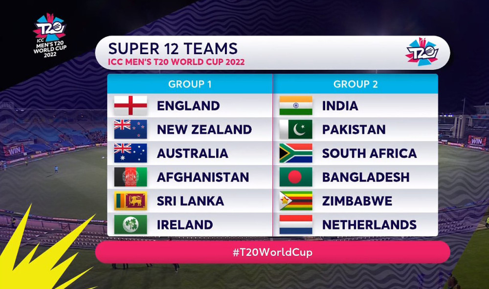 सुपर १२ को समूह ‘ए’ मा इंग्ल्यान्ड, अष्ट्रेलिया, न्युजिल्यान्ड, अफगानिस्तान, श्रीलंका र आयरल्यान्ड तथा समूह ‘बी’ मा भारत, पाकिस्तान, दक्षिण अफ्रिका, बंगलादेश, जिम्बावे र नेदरल्यान्ड्स रहेका छन् ।