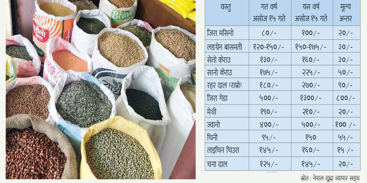 यसबिचमा महँगो नभएको कुनै वस्तु नै छैन । चामल, दाल, गेडागुडी, आँटा, चिउरा, चिनी सबै महँगिएको छ । चिनीमा त पछिल्लो पटक कालो बजारी नै भएको छ ।नेपाल खुद्रा व्यापार सङ्घका अनुसार अघिल्लो वर्ष ८० रुपियाँमा पाइने जिरा मसिनो चामल अहिले बढेर प्रतिकेजीको ९५ देखि एक सय रुपियाँ पुगेको छ । रहर दाल प्रतिकेजी १८० रुपियाँबाट बढेर २७० रुपियाँ पुगेको छ । सो अवधिमा सेतो केराउ प्रतिकेजी १३० रुपियाँबाट बढेर १६० रुपियाँ, सानो केराउ प्रतिकेजी १७० रुपियाँबाट बढेर २२५ रुपियाँ पुगेको छ । हरियो केराउ बजारमा अहिले पाइनै छोडेको छ ।