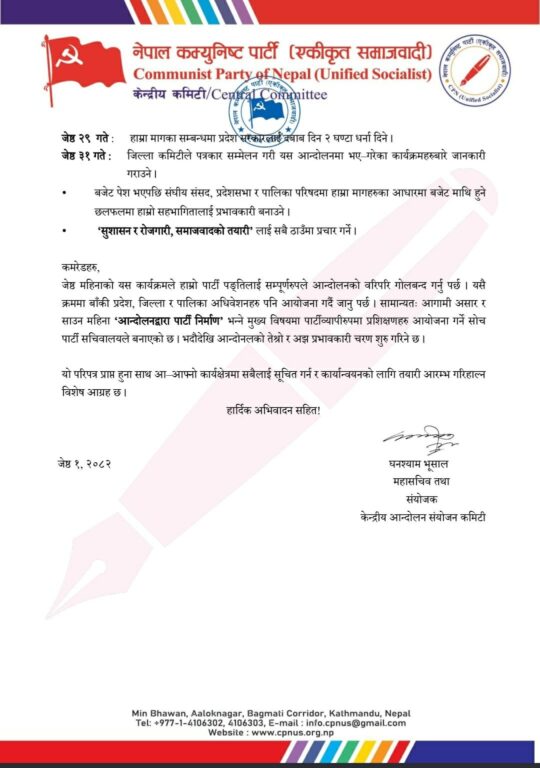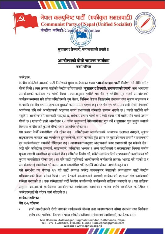 काठमाडौँ । नेकपा (एकीकृत समाजवादी)ले दोस्रो चरणको आन्दोलनका कार्यक्रम घोषणा गरेको छ ।सचिवालय बैठकले दोस्रो चरणको आन्दोलनको रूपरेखा तय गरेर जेठ ६ गते देशभरका पार्टी कमिटीलाई परिपत्र जारी गरेको हो ।
