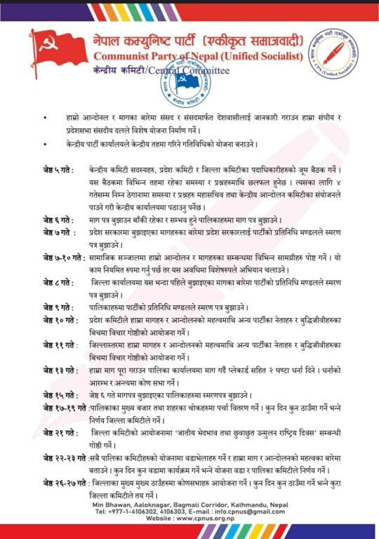 महासचिव घनश्याम भुसालले जारी गरेको परिपत्रमा दोस्रो चरणको आन्दोलनअन्तर्गत जेठ ५ देखि ३१ गतेसम्मका कार्यक्रम समावेश छन् ।वडादेखि केन्द्रसम्मका आन्दोलन कार्यक्रम अन्तर्गत कोणसभा, धर्ना, विचारगोष्ठी, मागपत्र बुझाउनेलगायत छन् ।