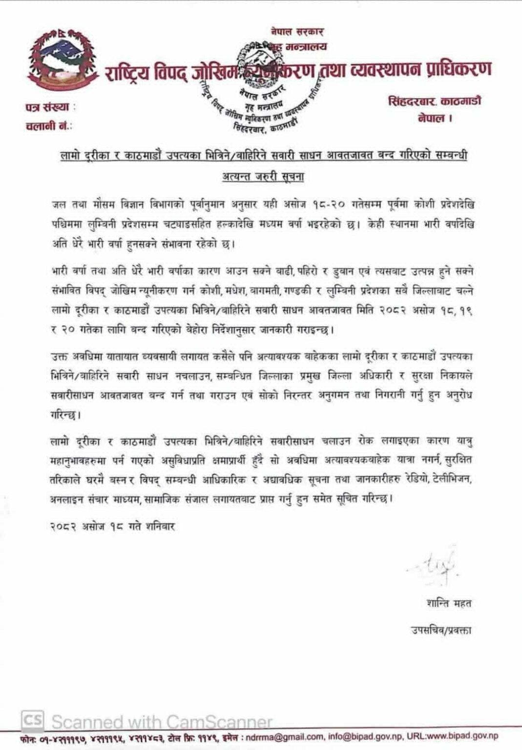 प्राधिकरणले भनेको छ– ‘अति भारी वर्षाका कारण आउन सक्ने बाढी, पहिरो र डुबान तथा त्यसबाट उत्पन्न हुनसक्ने सम्भावित विपद् जोखिम न्यूनीकरण गर्न कोशी, मधेस, बागमती, गण्डकी र लुम्बिनी प्रदेशका सबै जिल्लाबाट चल्ने लामो दूरीका र काठमाडौं उपत्यका भित्रिने र बाहिरिने सवारी साधन आवतजावत २०८२ साल असोज १८ देखि २० गते सम्मका लागि बन्द गरिएको छ ।