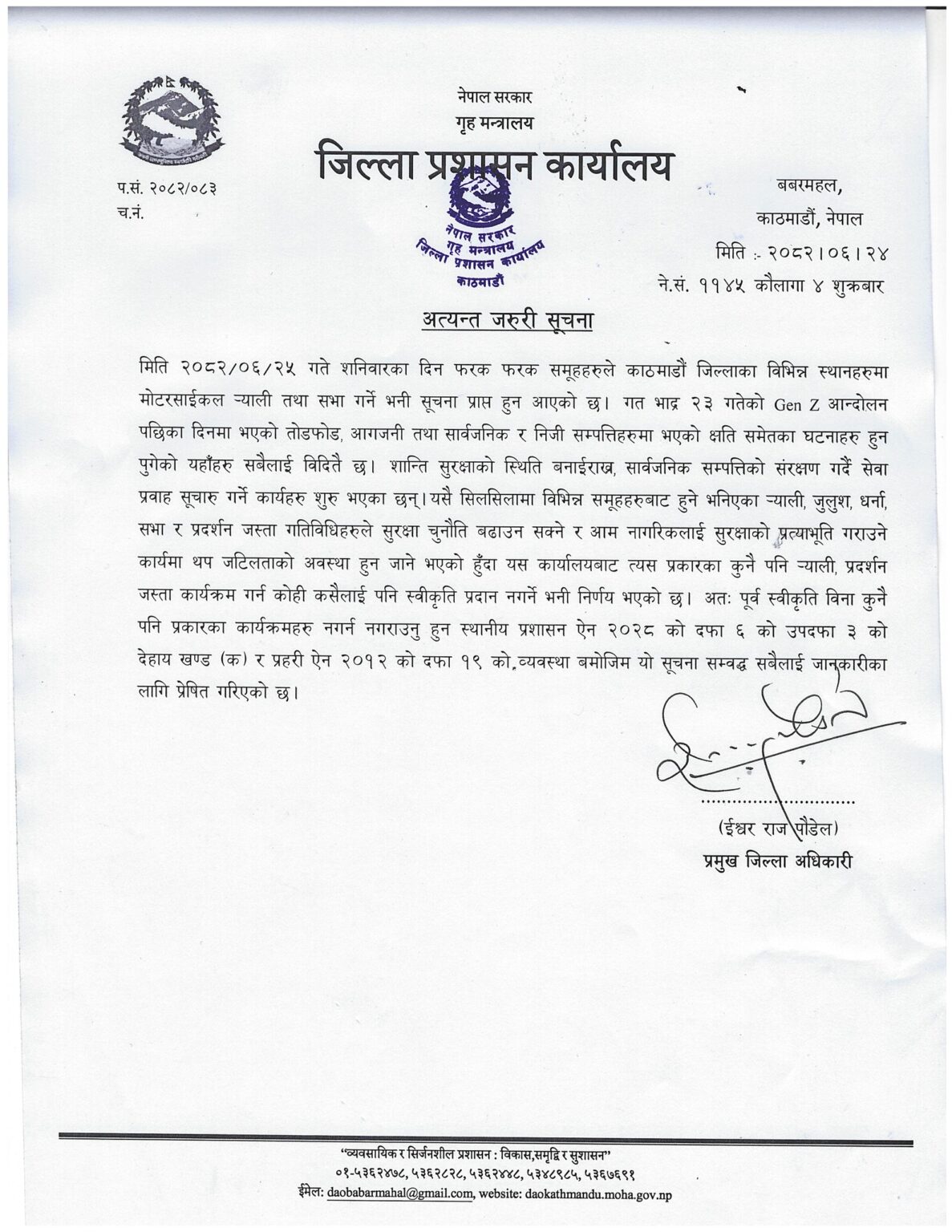 काठमाडौंका प्रमुख जिल्ला अधिकारी ईश्वरराज पौडेलले जारी गरेको सूचनामा भनिएको छ, ‘आम नागरिकलाई सुरक्षाको प्रत्याभूति गराउन कार्यमा थप जटिलताको अवस्था हुन जाने भएको हुँदा यस कार्यालयबाट त्यस प्रकारका कुनै पनि र्याली, प्रदर्शन जस्ता कार्यक्रम गर्न कोही कसैलाई पनि स्वीकृति प्रदान नगर्ने भनी निर्णय भएको छ । अतः पूर्व स्वीकृति विना कुनै पनि प्रकारका कार्यक्रमहरु नगर्न नगराउनु हुन स्थानीय प्रशासन ऐन २०२८ को दफा ६ को उपदफा ३ को देहाय खण्ड (क) र प्रहरी ऐन २०१२ को दफा १९ को व्यवस्था बमोजिम यो सूचना सम्वद्ध सबैलाई जानकारीका लागि प्रेषित गरिएको छ।’