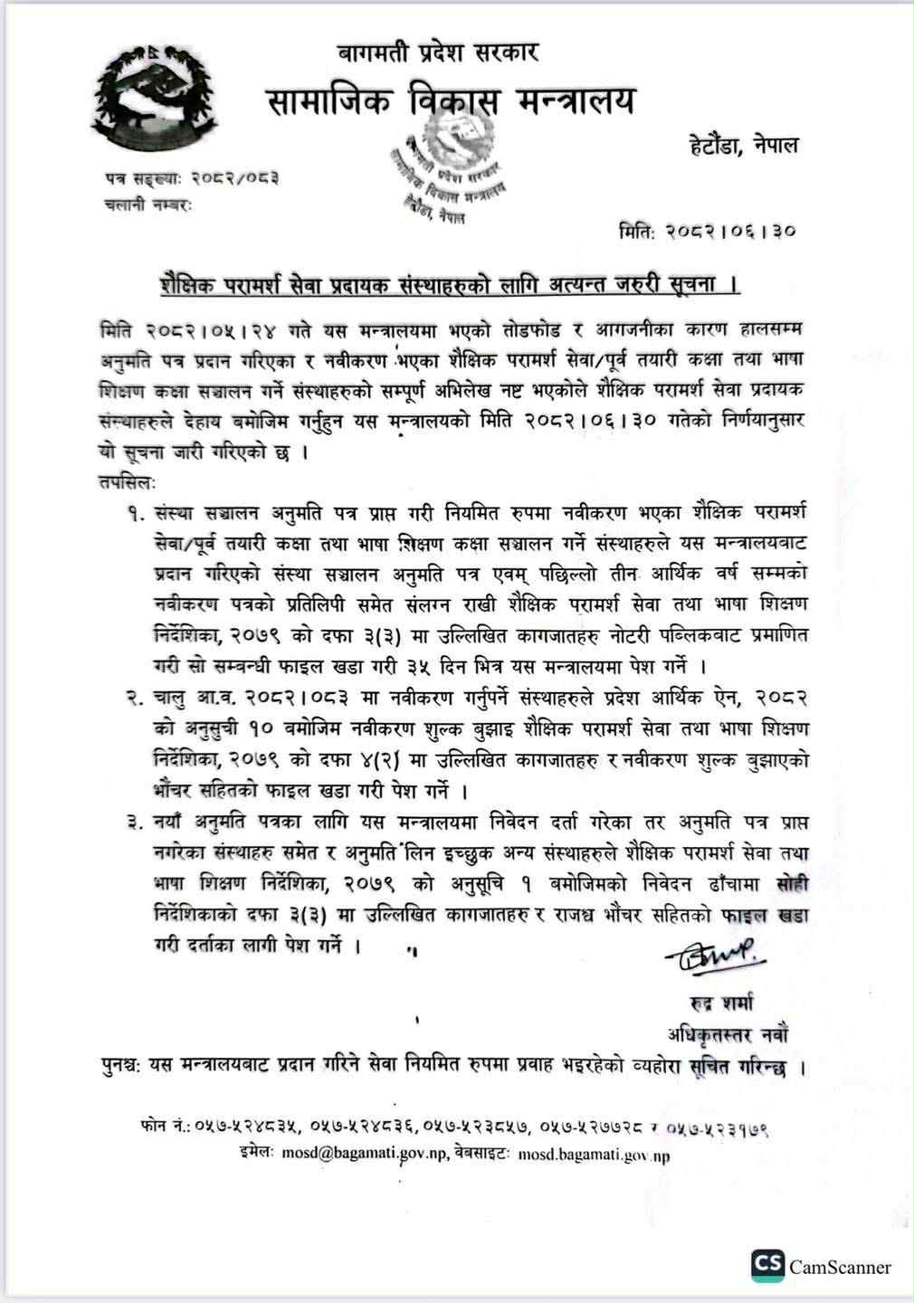 मन्त्रालयले संस्था सञ्चालन अनुमति पत्र प्राप्त गरी नियमित रुपमा नवीकरण भएका शैक्षिक परामर्श सेवा/पूर्व तयारी कक्षा तथा भाषा शिक्षण कक्षा सञ्चालन गर्ने संस्थाहरुले यस मन्त्रालयवाट प्रदान गरिएको संस्था सञ्चालन अनुमति पत्र एवम् पछिल्लो तीन आर्थिक वर्ष सम्मको नवीकरण पत्रको प्रतिलिपी समेत संलग्न राखी शैक्षिक परामर्श सेवा तथा भाषा शिक्षण निर्देशिका, २०७९ को दफा ३(३) मा उल्लिखित कागजातहरु नोटरी पब्लिकवाट प्रमाणित गरी सो सम्बन्धी फाइल खडा गरी ३५ दिन भित्र मन्त्रालयमा पेश गर्न अनुरोध गरेको छ ।