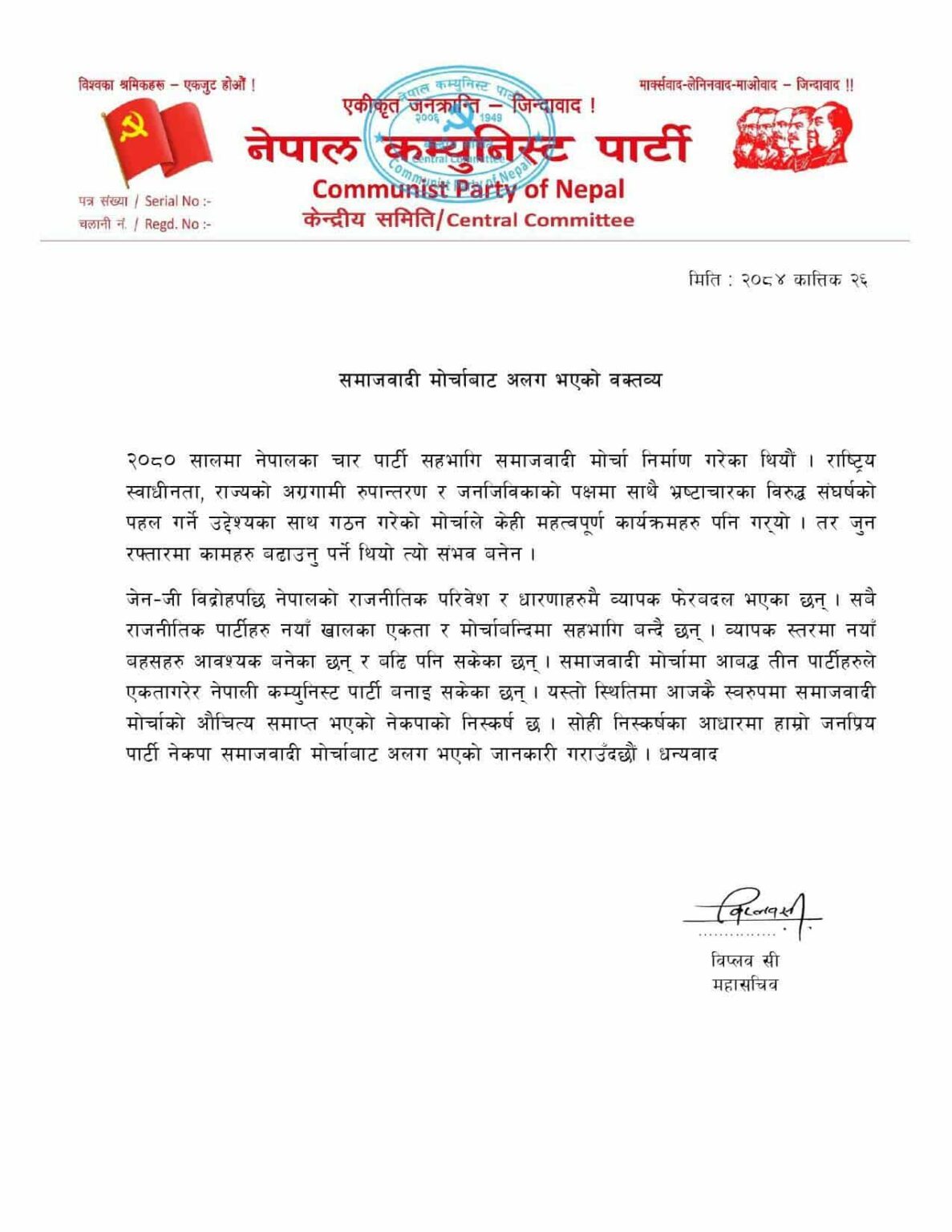 ‘समाजवादी मोर्चामा आबद्ध तीन पार्टीहरू नै एकता भई नेपाली कम्युनिस्ट पार्टी गठन गरिसकेका छन्, त्यसैले मोर्चाको वर्तमान स्वरूपको औचित्य समाप्त भएको निष्कर्षमा पुगेका छौँ’, उनले भनेका छन् ।