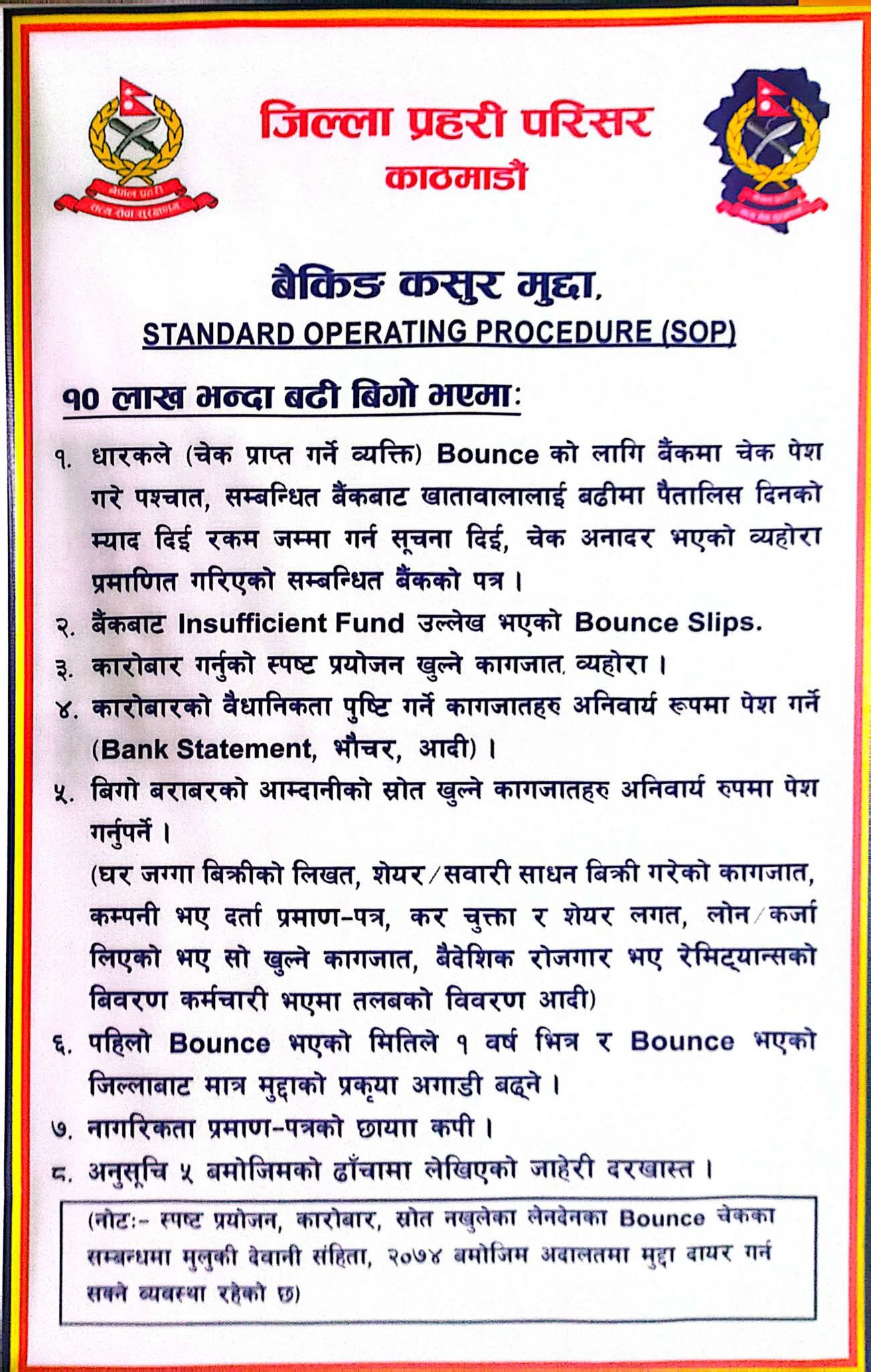 यस्तै घर जग्गा बिक्रीको लिखत, शेयर/सवारी साधन विक्री गरेको कागजात, कम्पनी भए दर्ता प्रमाण–पत्र, कर चुक्ता र शेयर लगत, लोन /कर्जा लिएको भए सो खुल्ने कागजात, वैदेशिक रोजगार भए रेमिट्यान्सको विवरण कर्मचारी भएमा तलबको विवरण आदी) पेश गर्नुपर्नेछ । पहिलो बाउन्स भएको मितिले १ वर्ष भित्र र बाउन्स भएको जिल्लाबाट मात्र मुद्दाको प्रक्रिया अगाडी बढ्ने जनाएको छ यस्तै नागरिकता प्रमाण–पत्रको छायाँ कपी र अनुसूची ५ बमोजिमको ढाँचामा लेखिएको जाहेरी दरखास्त पेश गर्नुपर्नेछ । यदी स्पष्ट प्रयोजन, कारोबार, स्रोत नखुलेका लेनदेनका बाउन्स चेकका सम्बन्धमा मुलुकी देवानी संहिता, २०७४ बमोजिम अदालतमा मुद्दा दायर गर्न सक्ने व्यवस्था रहेको छ र अदालतमा ५ वर्ष सम्ममा मुद्दा दर्ता गर्न सकिनेछ उल्लेख गरिएको छ ।