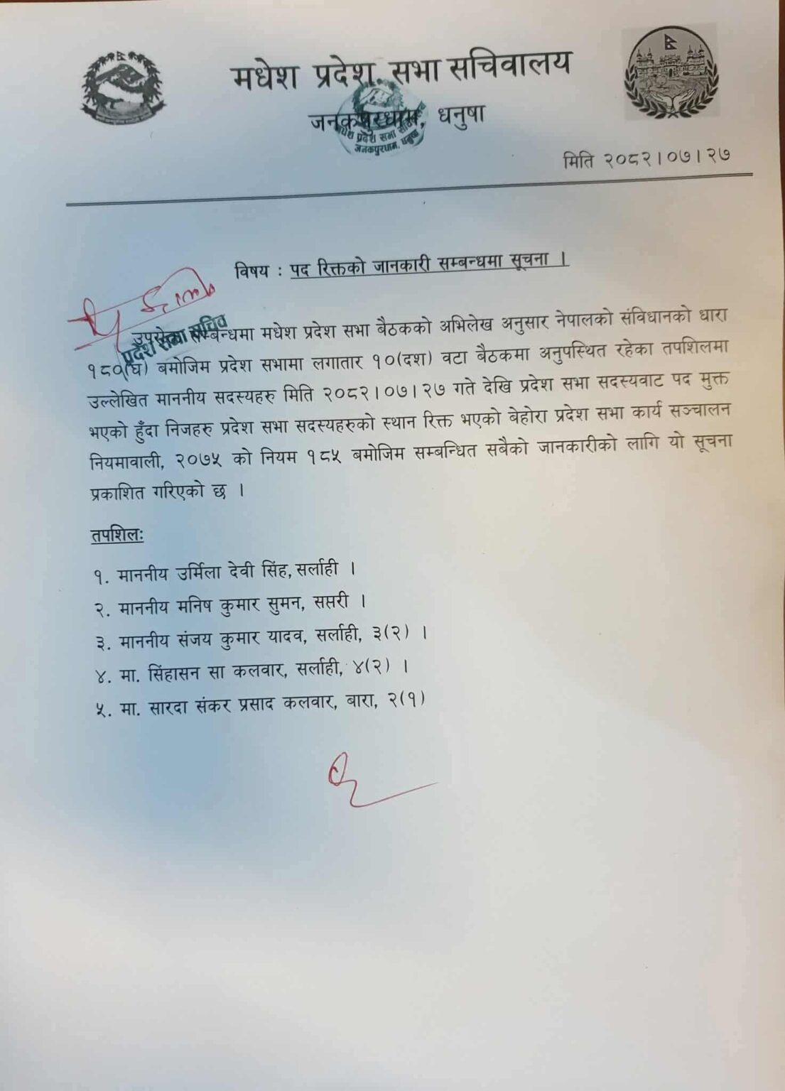 काठमाडौँ। मधेश प्रदेश सभाका ५ जना सदस्य पदमुक्त भएका छन्।