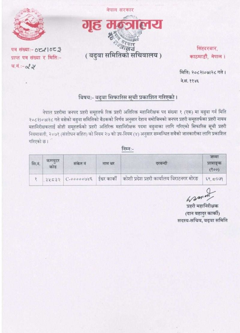 दानबहादुर कार्कीको प्रहरी महानिरीक्षकमा पदोन्नति भएपछि एआईजी पद रिक्त रहेको थियो । प्रहरी नियमावली, २०७१ को नियम २७ को उपनियम (४) अनुसार बढुवा सिफारिस सूची प्रकाशित गरिएको प्रहरी प्रधान कार्यालयले जनाएको छ ।