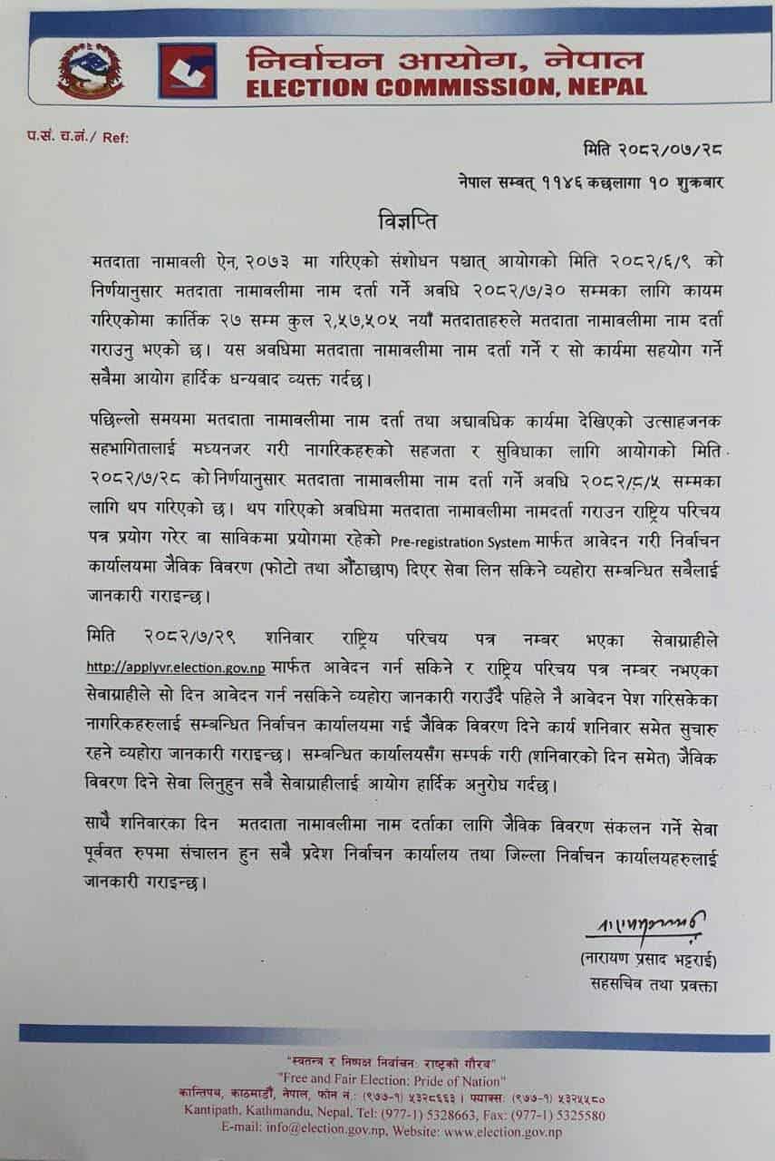 पछिल्लो समयमा मतदाता नामावलीमा नाम दर्ता तथा अद्यावधिक कार्यमा देखिएको उत्साहजनक सहभागितालाई मध्यनजर गरी नागरिकहरूको सहजता र सुविधाका लागि आयोगको शुक्रबारको निर्णयानुसार मतदाता नामावलीमा नाम दर्ता गर्ने अवधि मङ्सिर ५ सम्मका लागि थप गरेकाे छ ।