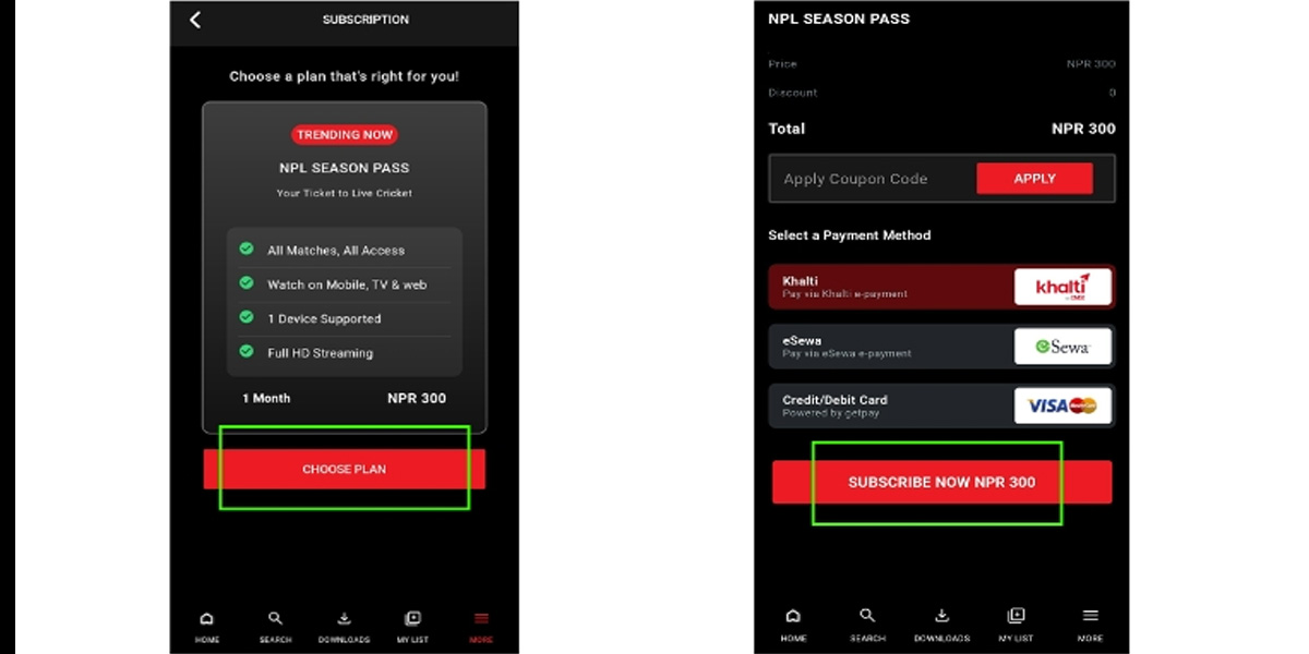 अब त्यहाँ तपाईँले आफ्नो लोकेसन अनुसारको एनपीएल सिजन पास देखु हुनेछ । त्यसमा रहेको चुज प्लान विकल्प रोज्नुहोस् र सहजता अनुरूप भुक्तानीका लागि खल्ती, इसेवा वा भिसा तथा मास्टरकार्ड मध्ये कुनै माध्यम छानेर अन्तिममा रहेको सस्क्राइब नाउ लेखिएको बटनमा ट्याप गर्नुहोस् ।