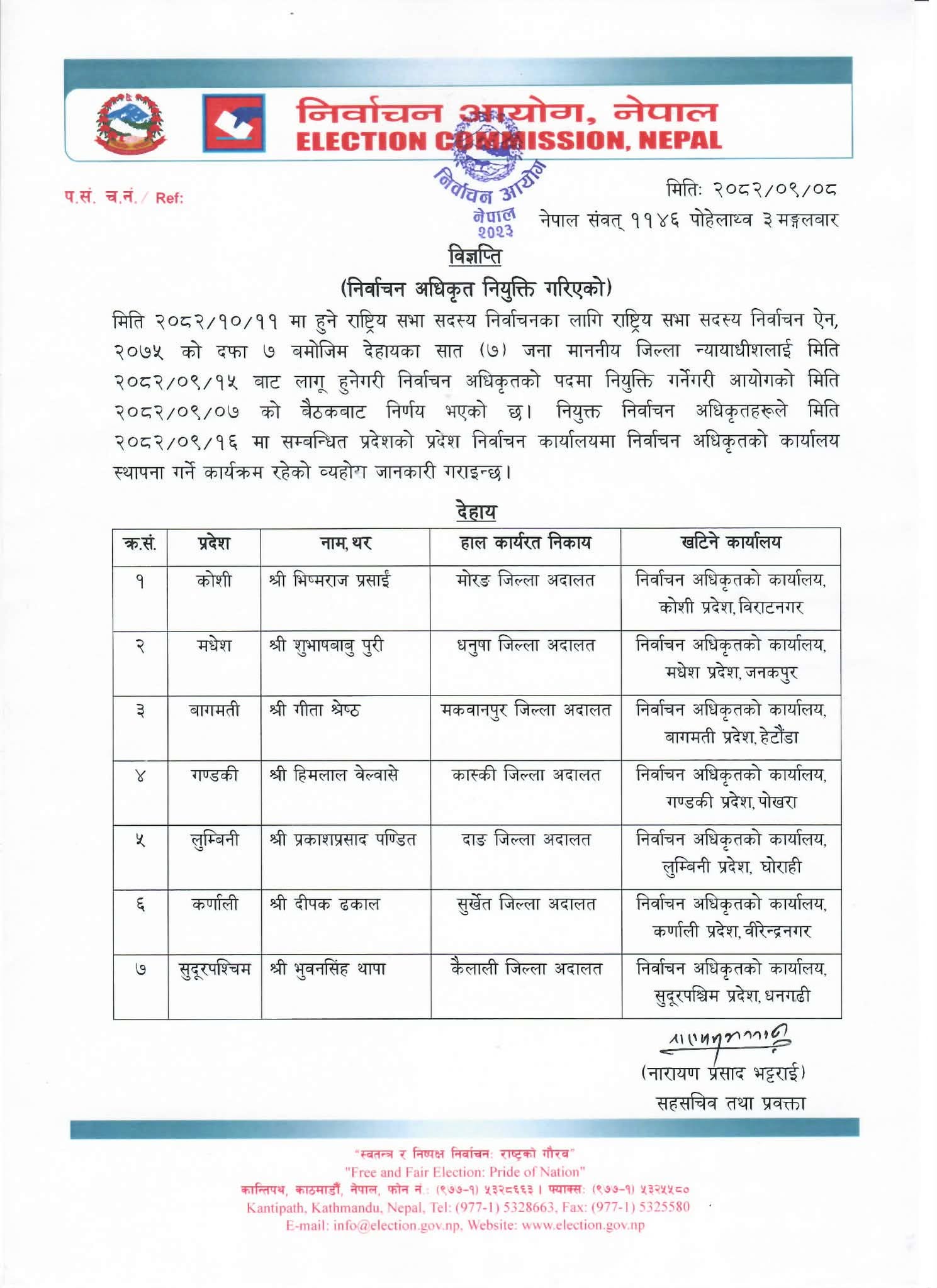 त्यस्तै मधेस प्रदेशमा धनुषा जिल्ला अदालतका शुभाषबाबु पुरी, बागमतीमा मकवानपुर जिल्ला अदालतका गीता श्रेष्ठ, गण्डकीमा कास्की जिल्ला अदालतका हिमलाल वेल्वासे, लुम्बिनीमा दाङ जिल्ला अदालतका प्रकाशप्रसाद पण्डित, कर्णालीमा सुर्खेतका दीपक ढकाल र सुदूरपश्चिमका लागि कैलाली जिल्ला अदालतका भुवनसिंह थापा निर्वचन अधिकृतमा नियुक्त भएका छन् ।