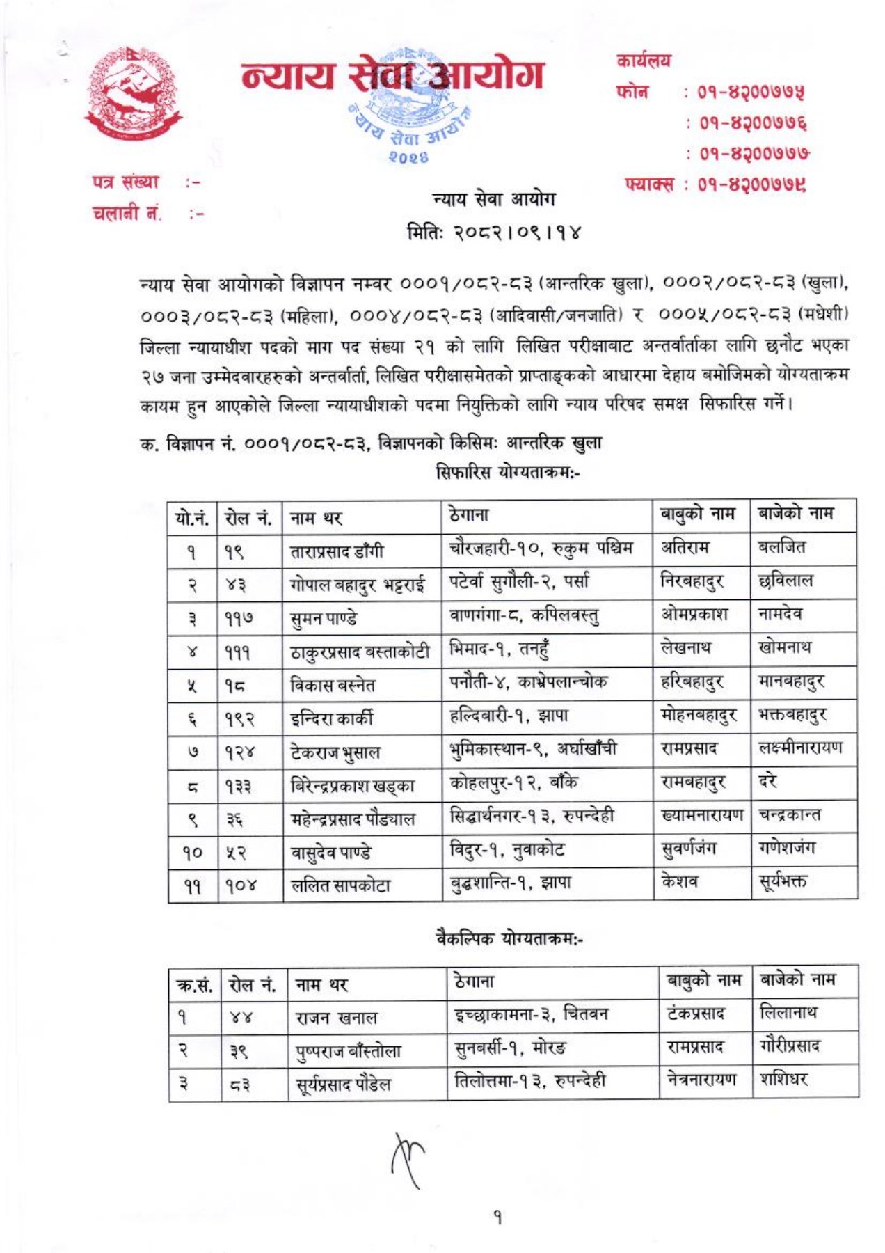 न्याय सेवा आयोगले न्यायाधीश नियुक्तिका लागि सोमबार न्याय परिषद्समक्ष सिफारिस गरेको छ। जिल्ला न्यायाधीशमा आन्तरिक खुलाबाट ११ जना, खुलाबाट ६ जना, महिला १ जना र आदिवासी जनजाति २ जना छानिएका छन्।