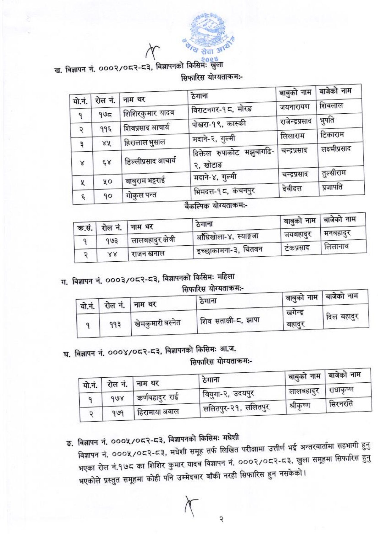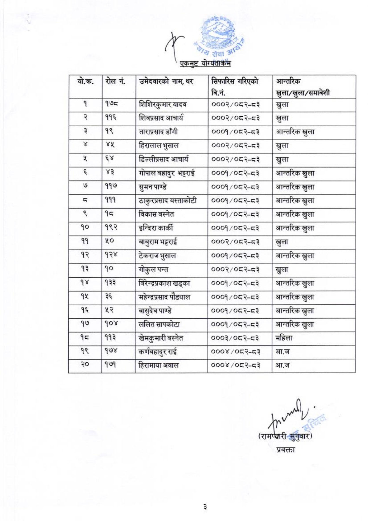 लिखित परीक्षा उत्तीर्ण गरेर अन्तर्वार्ताका लागि २७ जना छनोट भएका थिए। उनीहरूको सबै प्राप्ताङ्कको आधारमा योग्यताक्रम कायम गर्दै नियुक्तिका लागि सिफारिस गरिएको हो।