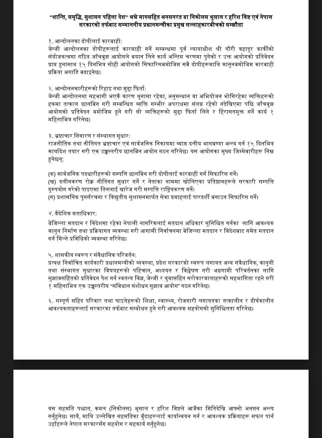 सहमतिपत्रमा भुसाल पक्षबाट उनी स्वयं र विष्टको हस्ताक्षर छ भने सरकारको तर्फबाट प्रधानमन्त्रीका मुख्य सल्लाहकार अजयभद्र खनालको हस्ताक्षर छ ।