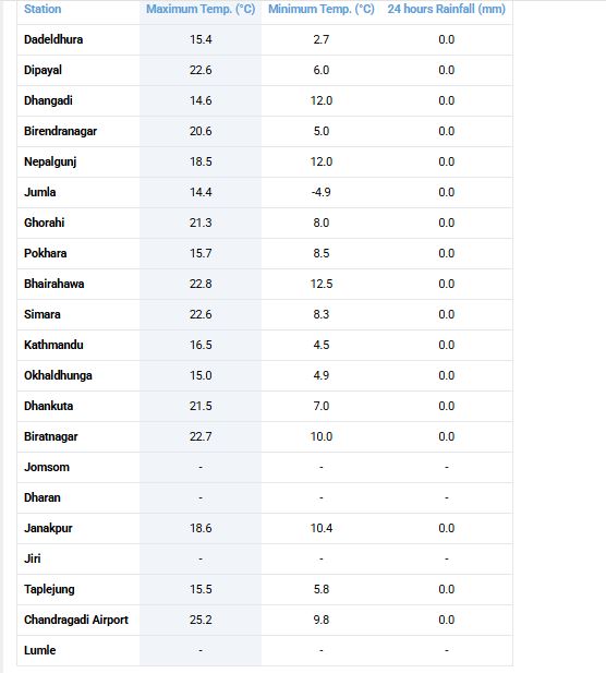 विभागले देशका १७ स्थानको तापक्रमका विवरण सार्वजनिक गरेको छ । विवरणमध्ये जुम्लाको न्यूनतम तापक्रम सबैभन्दा कम –४.९ डिग्री छ । डडेलधुराको न्यूनतम तापक्रम २.७, दिपायलको ६, ताप्लेजुङको ५.८ डिग्री सेल्सियस रहेको छ ।
