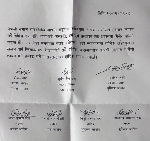 काठमाडौँ । मधेशका विभिन्न जिल्लामा धार्मिक सप्रदायबीच आपसी सद्भाव कायम गर्न विभिन्न ७ वटा आयोगले आग्रह गरेका छन् । सोमबार संयुक्त विज्ञप्ति जारी गर्दै सबै धार्मिक सम्प्रदायबीच सद्भाव र मैत्री कायम गर्न भनेका हुन् ।