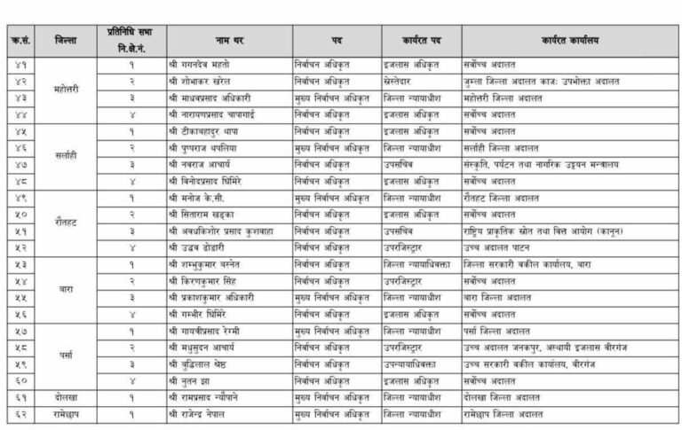 आयोगले न्याय परिषद्को परामर्शमा ७७ जिल्ला न्यायाधीशलाई मुख्य निर्वाचन अधिकृत र न्याय सेवा आयोगको परामर्शमा ८८ जना न्याय सेवाका अधिकृतलाई निर्वाचन अधिकृतमा नियुक्त गरेको छ ।