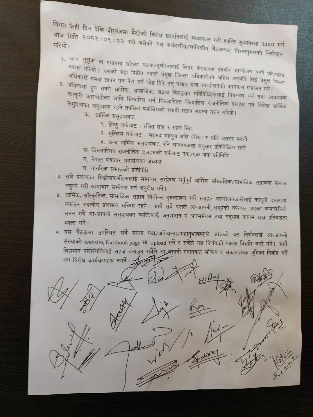 बैठकले अन्यत्र भएका घटना वा दुर्घटनालाई लिएर वीरगञ्जमा विरोध प्रदर्शन नगर्ने निर्णय गरेको छ। कुनै प्रदर्शन गर्नु परेमा प्रमुख जिल्ला अधिकारीको पूर्व अनुमति लिएर मात्र शान्तिपूर्ण ढंगले कार्यक्रम सञ्चालन गर्ने सहमति भएको छ।