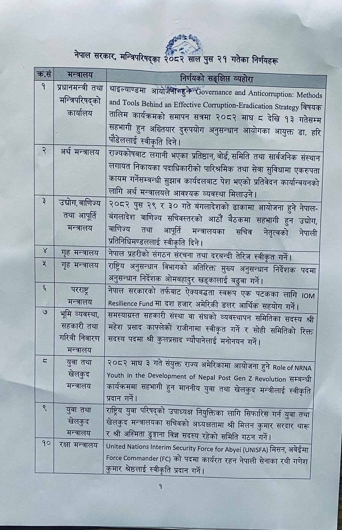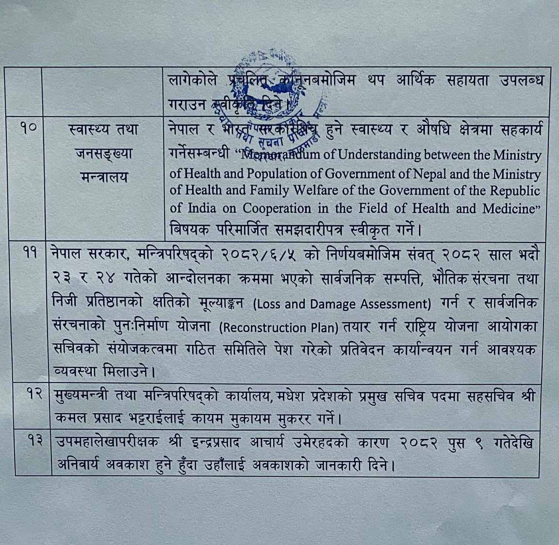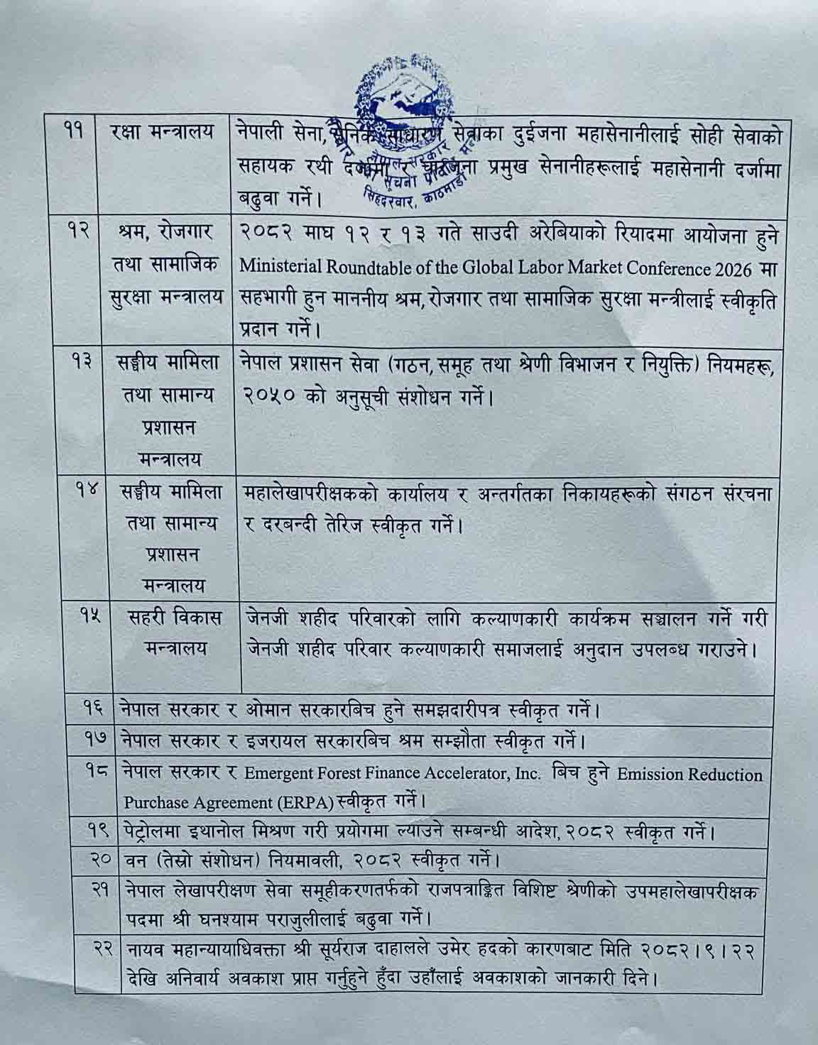 काठमाडौं । सरकारले मन्त्रिपरिषद् बैठकका निर्णय सार्वजनिक गरेको छ ।