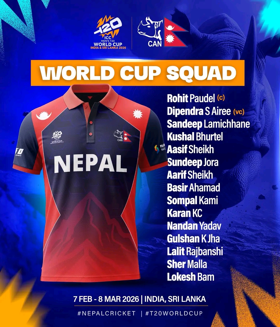 काठमाडौं । नेपाल क्रिकेट संघ (क्यान)ले आगामी फेब्रुअरी ७ देखि भारत र श्रीलंकामा आयोजना हुन लागेको २०२६ आईसीसी पुरुष टी-२० विश्वकपका लागि १५ सदस्यीय अन्तिम नेपाली टोलीको घोषणा गरेको छ।
