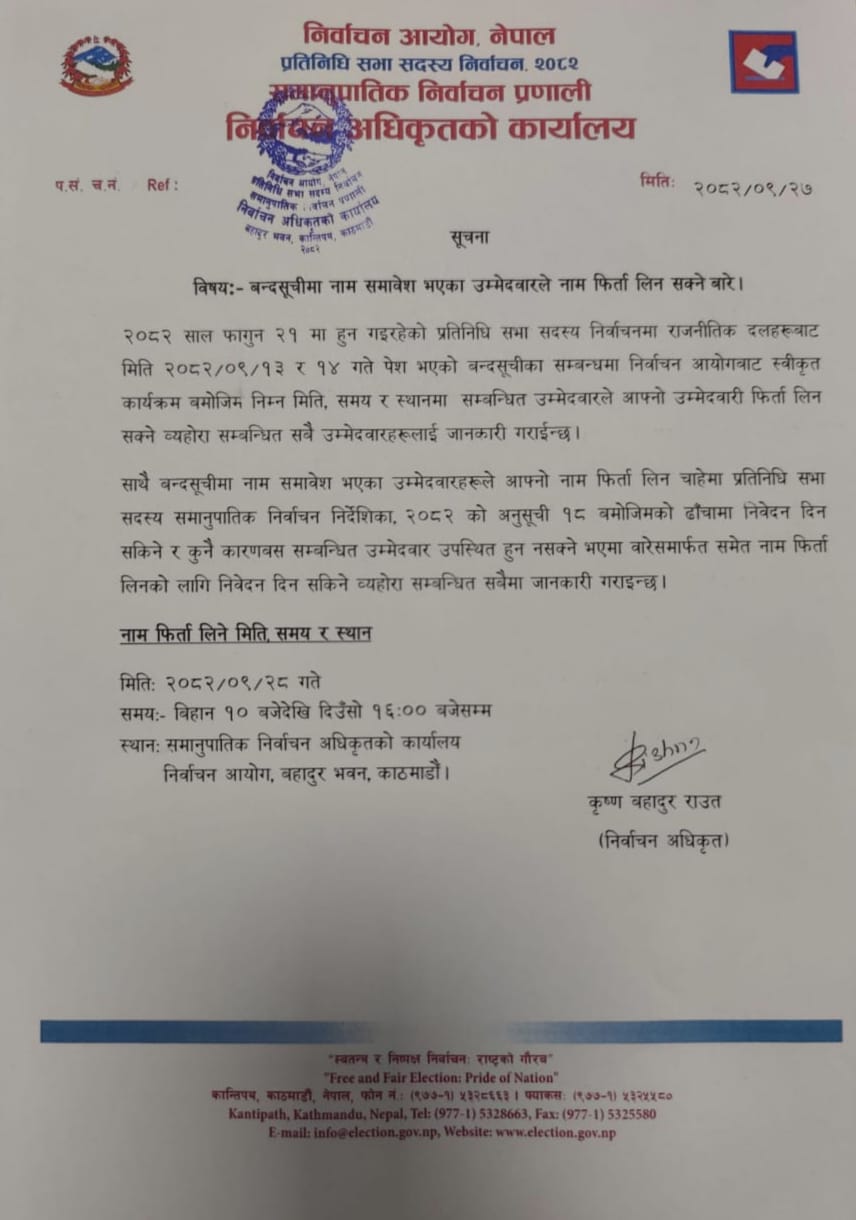 नाम फिर्ता लिन चाहनेहरूले भाेलि बिहान १० बजेदेखि दिउँसो ४ बजेसम्म निर्वाचन आयोगको समानुपातिक निर्वाचन अधिकृतको कार्यालयमा निवेदन दिन सक्ने निर्वाचन अधिकृत कृष्णबहादुर राउतले निकाल्नुभएकाे सूचनामा उल्लेख छ ।