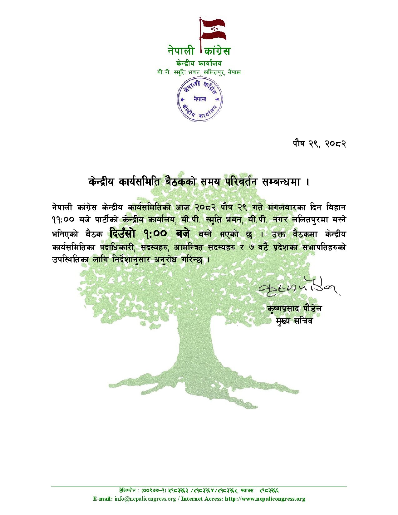 काठमाडौँ । नेपाली कांग्रेसको केन्द्रीय कार्यसमिति बैठक सरेको छ । बिहान ११ बजे पार्टी केन्द्रीय कार्यालय सानेपामा बस्ने गरी बोलाइएको कार्यसमिति बैठक दिउँसो १ बजे बस्ने गरी सरेको मुख्यसचिव कृष्णप्रसाद पौडेलले बताए ।