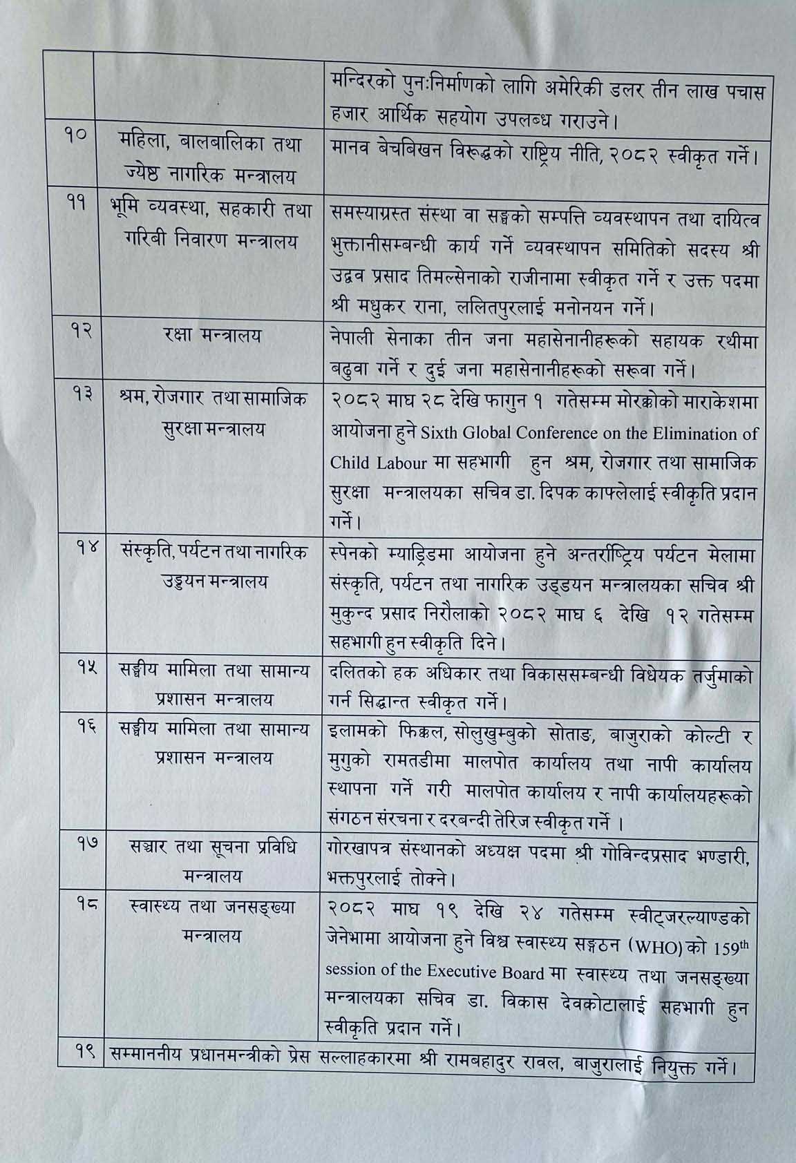 खरेलले मानव बेचबिखनविरुद्धको राष्ट्रिय नीति, २०८२ स्वीकृत गरिएको जानकारी दिए । बैठकले दलितको हक अधिकार तथा विकास सम्बन्धी विधेयक तर्जुमा गर्न सैद्धान्तिक स्वीकृति प्रदान गरेको छ भने इलामको फिक्कल, सोलुखुम्बुको सोताङ, बाजुराको कोल्टी र मुगुको रामतडीमा मालपोत एवं नापी कार्यालय स्थापना गर्ने निर्णय पनि गरेको छ ।