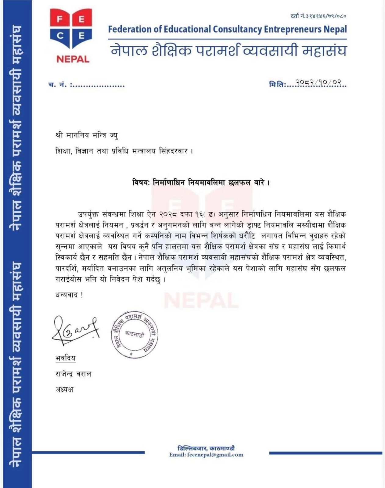 पत्रमा महासंघले शैक्षिक परामर्श क्षेत्रलाई व्यवस्थित, पारदर्शी र मर्यादित बनाउन महासंघको भूमिका अपरिहार्य रहेको उल्लेख गर्दै निर्माणाधीन नियमावलीबारे मन्त्रालय र महासंघबीच गम्भीर छलफल आवश्यक रहेको जनाएको छ।