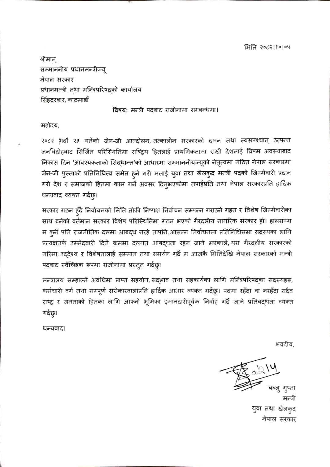काठमाडौं । युवा तथा खेलकुदमन्त्री बब्लु गुप्ताले पदबाट राजीनामा दिएका छन् । उनी रास्वपाको तर्फबाट चुनाव लड्ने तयारी छन् ।