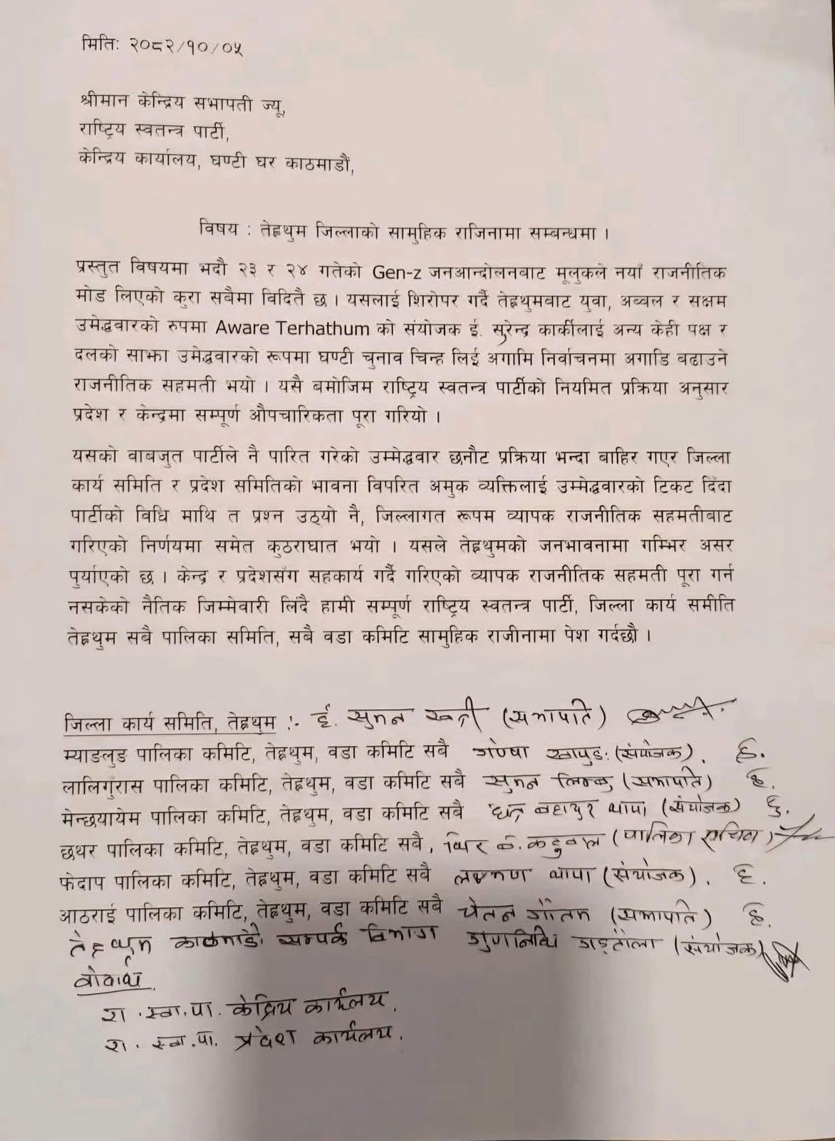 काठमाडौं । राष्ट्रिय स्वतन्त्र पार्टी (रास्वपा) तेह्रथुम जिल्लाका जिल्ला कार्य समिति, सबै पालिका समिति र वडा कमिटीका पदाधिकारीहरूले सामूहिक रूपमा राजीनामा दिएका छन्।