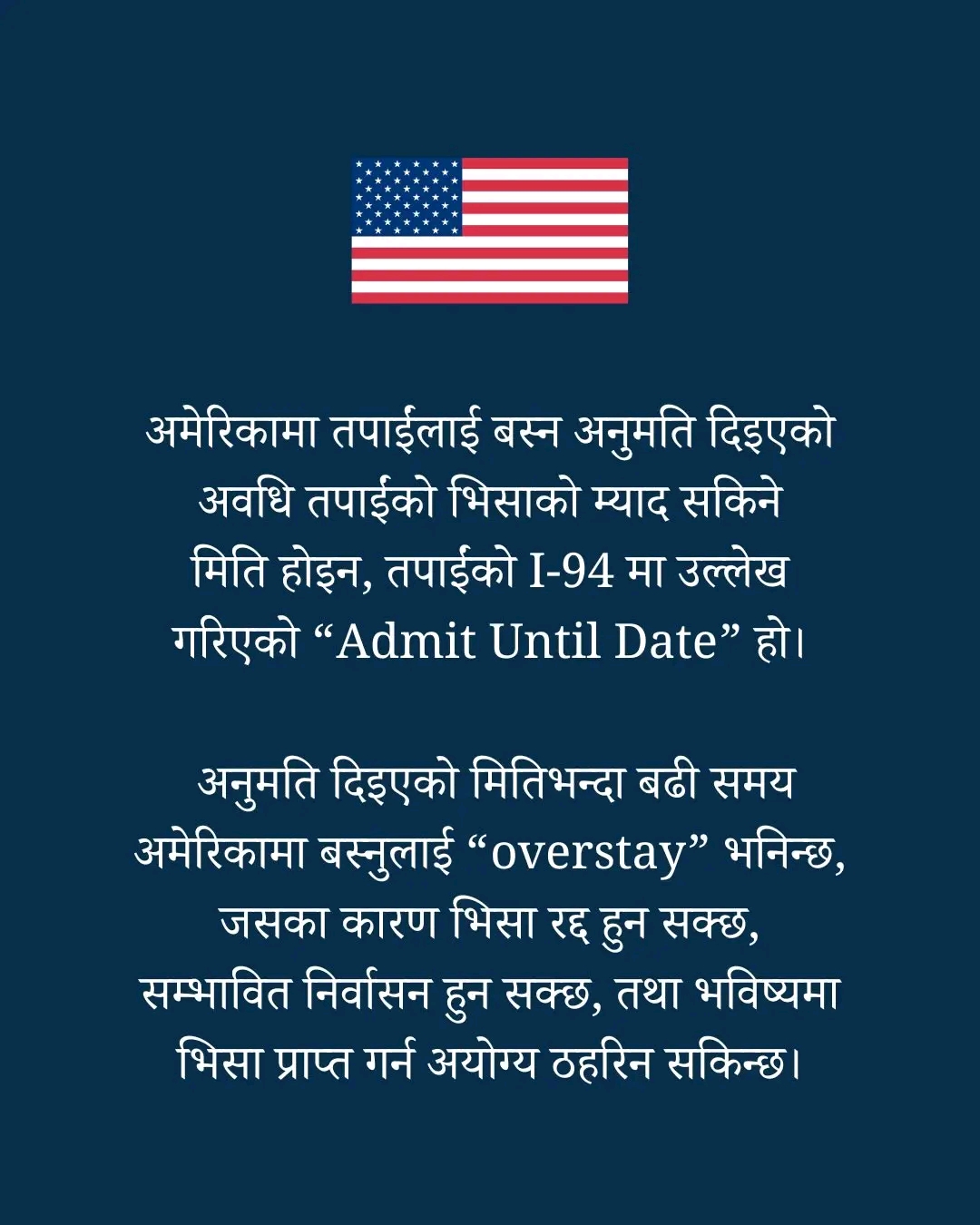 दूतावासले धेरै यात्रुहरू भिसाको म्याद हेरेर मात्र अमेरिकामा बस्न मिल्ने समय अनुमान गर्ने गरेको पाइएकाले यस विषयमा स्पष्ट पारेको हो । आई ९४ फारममा उल्लेख गरिएको मितिभन्दा बढी समय अमेरिकामा बस्नुलाई “ओभरस्टे” मानिन्छ। ओभरस्टे भएको खण्डमा भिसा स्वतः रद्द हुन सक्ने, देश निकाला हुन सक्ने तथा भविष्यमा अमेरिकी भिसा प्राप्त गर्न अयोग्य ठहरिने गम्भीर परिणाम भोग्नुपर्ने दूतावासले जनाएको छ ।