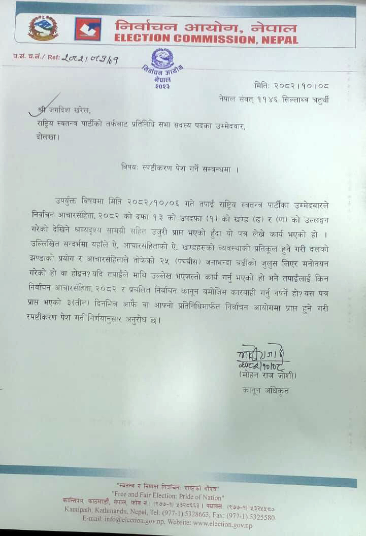 काठमाडौं । निर्वाचन आयोगले दोलखाबाट प्रतिनिधिसभा सदस्यका उम्मेदवार रहेका जगदिश खरेललाई निर्वाचन आचारसंहिता उल्लंघनको विषयमा स्पष्टीकरण सोधेको छ ।