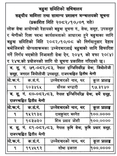 बढुवा समितिको बिहीबार बसेको बैठकले नेपाल इन्जिनियरिङ सेवा, जियोलोजी समूह, जनरल जियोलोजी उपसमूह, (द्वितीय श्रेणी) अन्तर्गत एक जना, नेपाल इन्जिनियरिङ सेवा, सर्भे समूह, (द्वितीय श्रेणी)अन्तर्गत दुई जना र नेपाल कृषि सेवा, कृषि प्रसार समूह, ( द्वितीय श्रेणी) अन्तर्गत एक जना शाखा अधिकृतलाई उपसचिव पदमा बढुवा सिफारिस गर्ने निर्णय गरेको थियो ।
