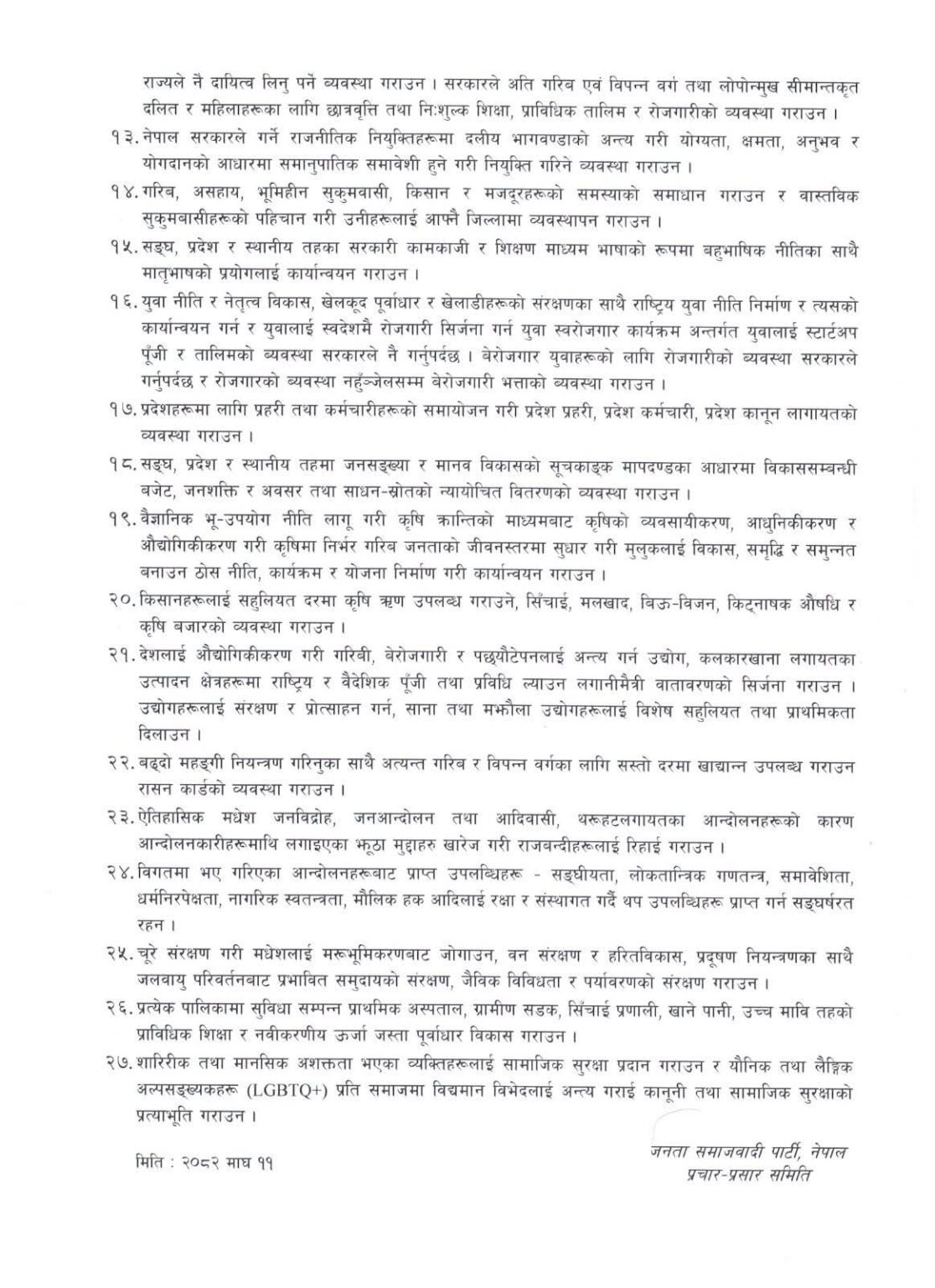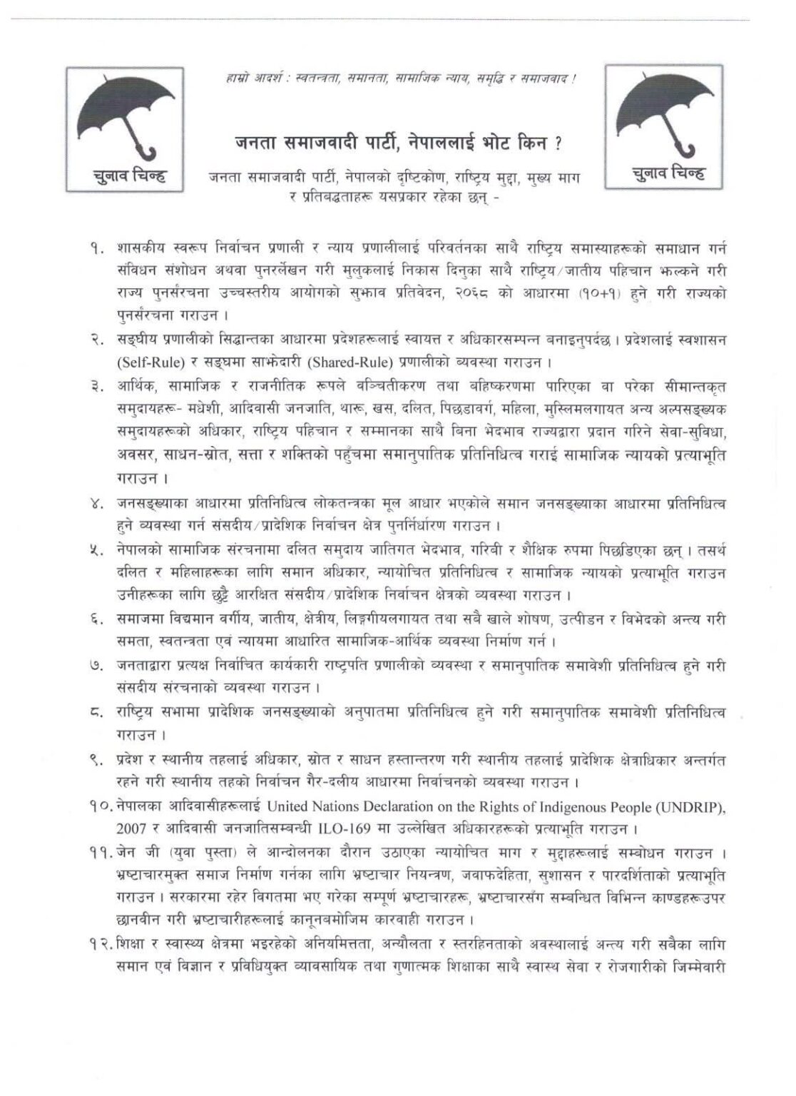 काठमाडौं । जनता समाजवादी पार्टी, नेपालले आगामी निर्वाचनलाई लक्षित गर्दै आफ्नो प्रतिबद्धता पत्र सार्वजनिक गरेको छ । आइतबार सार्वजनिक दस्तावेजमा पार्टीले स्वतन्त्रता, समानता, सामाजिक न्याय, समृद्धि र समाजवादलाई मूल आदर्शका रूपमा अघि सारेको छ ।