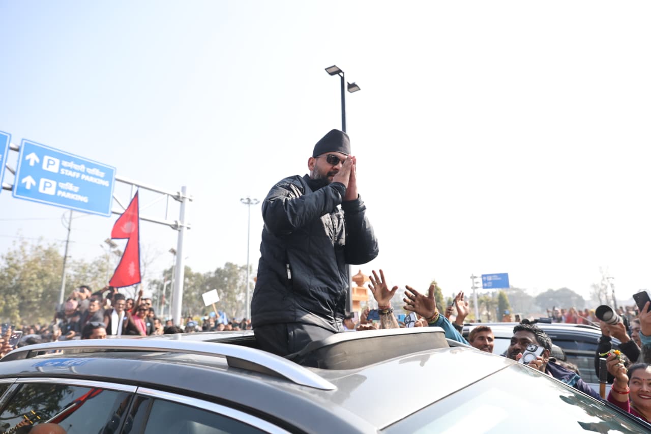 एयरपोर्टबाट रुफटप कारमा निस्किएका बालेनसँग सेल्फी खिच्ने र उनलाई हेर्न छतछतमा स्थानीय देखिएका छन् ।