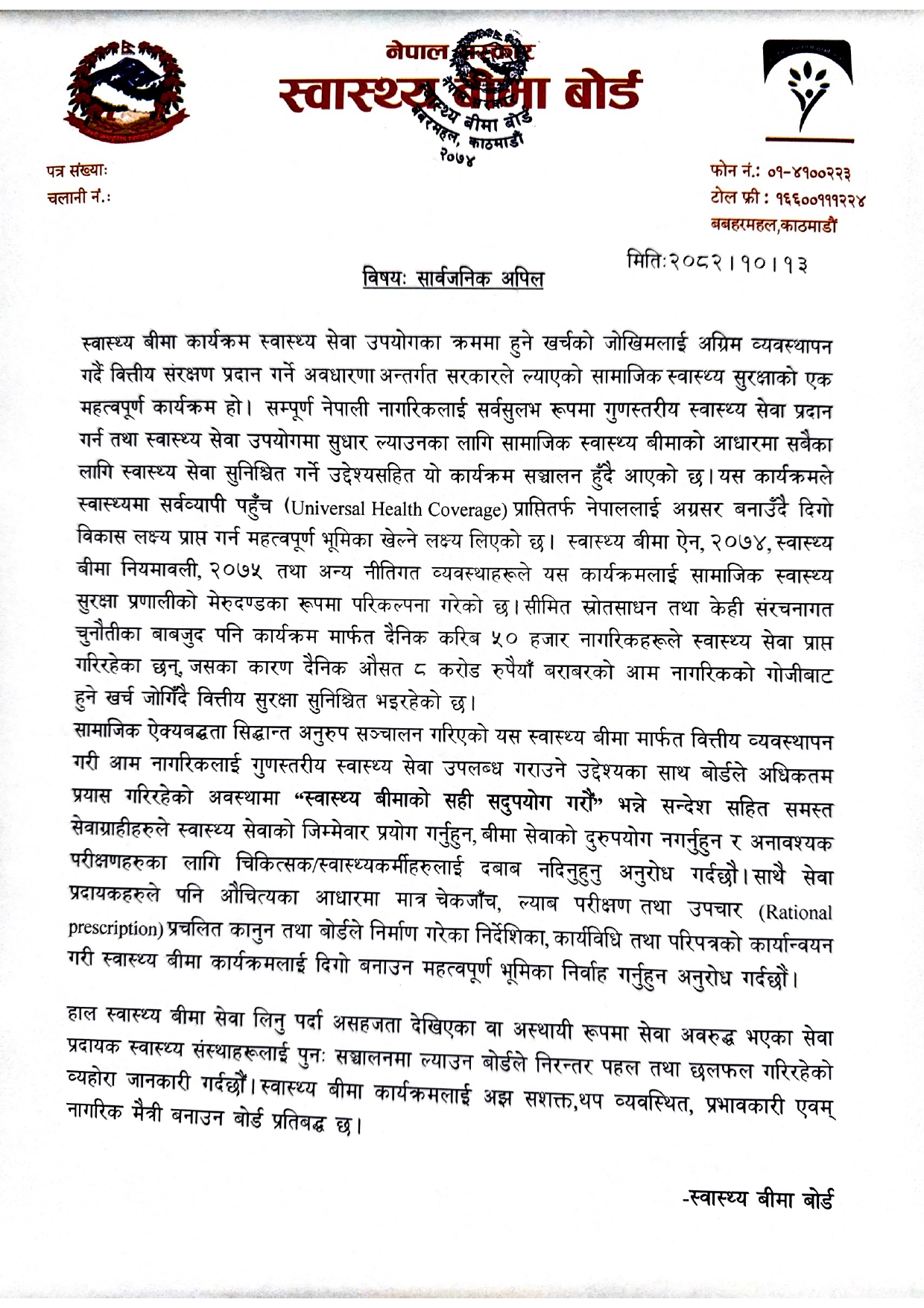 विज्ञप्तिमा लेखिएको छ, ‘सामाजिक ऐक्यबद्धता सिद्धान्त अनुरूप सञ्चालन गरिएको यस स्वास्थ्य बीमामार्फत वित्तीय व्यवस्थापन गरी आम नागरिकलाई गुणस्तरीय स्वास्थ्य सेवा उपलब्ध गराउने उद्देश्यका साथ बोर्डले अधिकतम प्रयास गरिरहेको अवस्थामा ‘स्वास्थ्य बीमाको सही सदुपयोग गरौं’ भन्ने सन्देशसहित समस्त सेवाग्राहीहरूले स्वास्थ्य सेवाको जिम्मेवार प्रयोग गर्नुहुन, बीमा सेवाको दुरुपयोग नगर्नुहुन र अनावश्यक परीक्षणहरूका लागि चिकित्सकरस्वास्थ्यकर्मीहरूलाई दबाब नदिनुहुनु अनुरोध गर्दछौं । साथै सेवा प्रदायकहरूले पनि औचित्यका आधारमा मात्र चेकजाँच, ल्याब परीक्षण तथा उपचार प्रचलित कानून तथा बोर्डले निर्माण गरेका निर्देशिका, कार्यविधि तथा परिपत्रको कार्यान्वयन गरी स्वास्थ्य बिमा कार्यक्रमलाई दिगो बनाउन महत्वपूर्ण भूमिका निर्वाह गर्नुहुन अनुरोध गर्दछौं ।’