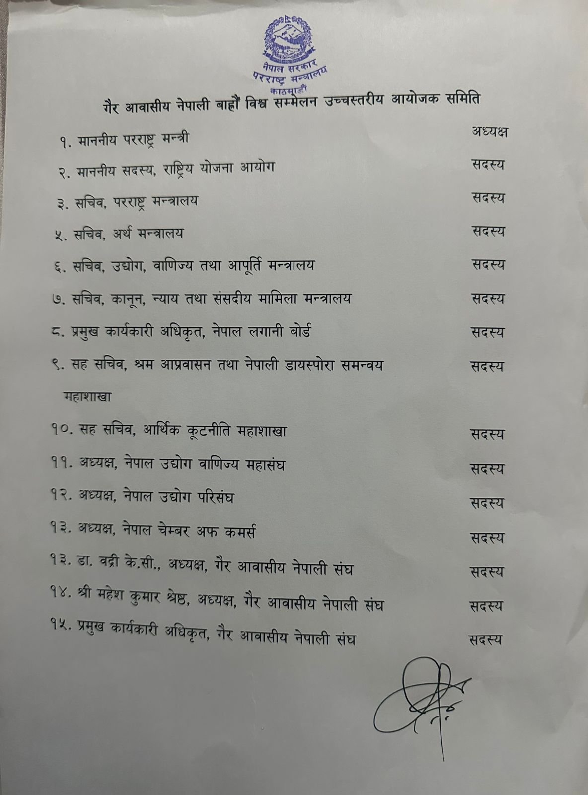 परराष्ट्र मन्त्रीस्तरको निर्णयअनुसार आगामी फागुन २९ देखि चैत्र २, २०८२ (मार्च १४–१६, २०२६) सम्म नेपालमा आयोजना हुने विश्व सम्मेलनको तयारी तथा व्यवस्थापनका लागि माननीय परराष्ट्र मन्त्री बालानन्द शर्माको अध्यक्षतामा परराष्ट्र मन्त्रालयले उच्चस्तरीय आयोजक समिति गठन गरेको हो ।