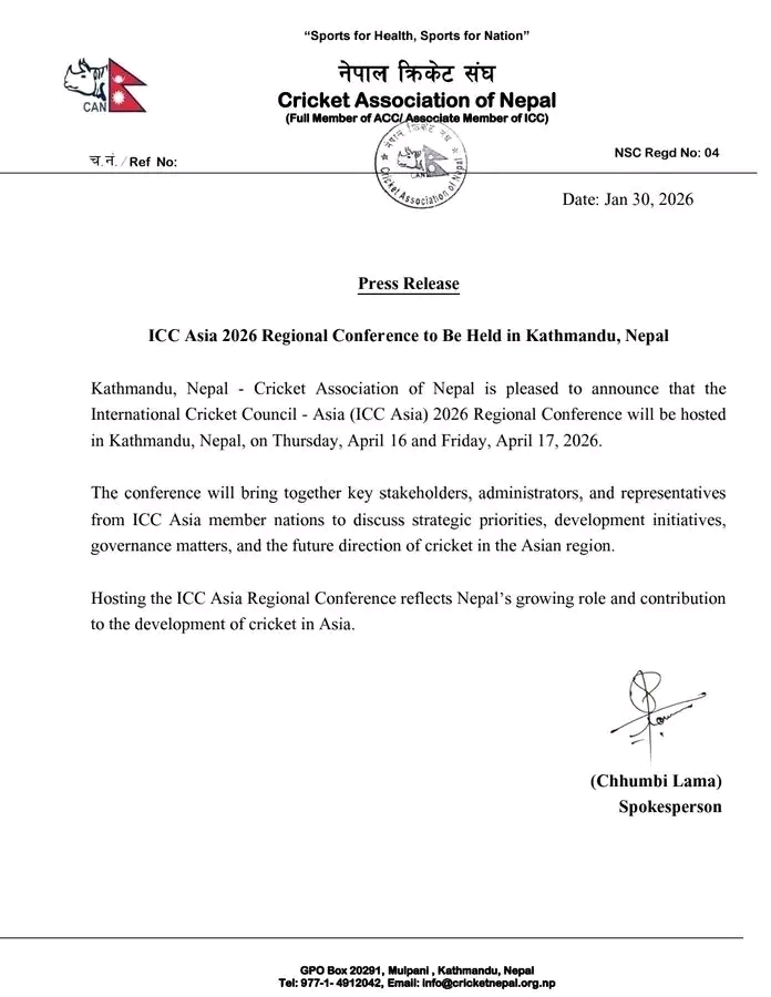 काठमाडौं । अन्तर्राष्ट्रिय क्रिकेट परिषद् (आईसीसी) को एसिया क्षेत्रीय सम्मेलन नेपालमा हुने भएको छ।