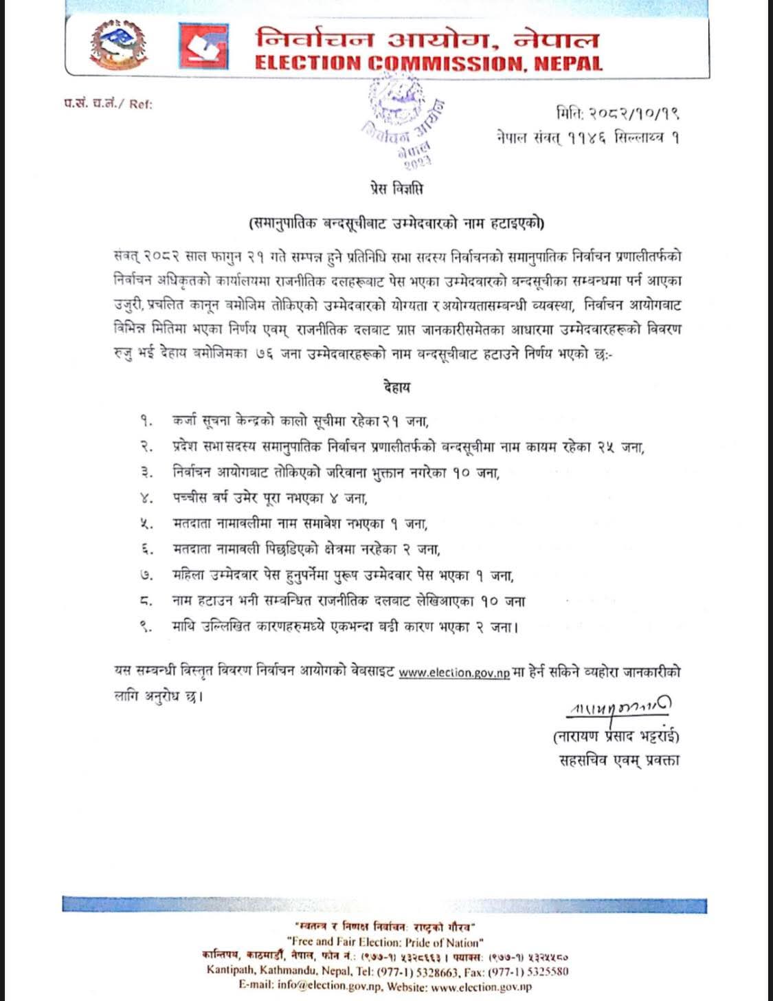 यस्तै, आयोगले तोकेको जरिवाना नतिरेका १० जना, २५ वर्ष उमेर पूरा नभएका ४ जना र मतदाता नामावलीमा नाम समावेश नभएका १ जनाको नाम पनि हटाइएको छ।