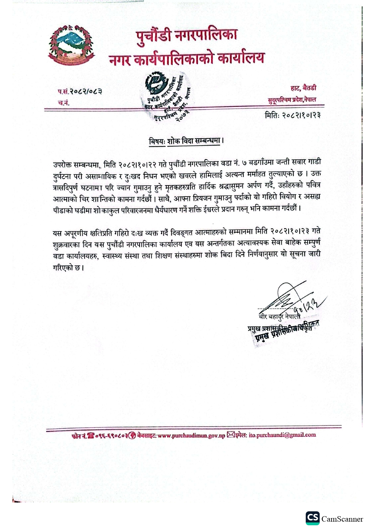 धनगढी । बैतडीको पुर्चौडी नगरपालिकाले आज शुक्रबार शोक बिदा दिएको छ । १३ जनाको ज्यान जानेगरी भएको बस दुर्घटनामा दुःख व्यक्त गर्दै नगरपालिकाले एक सूचना जारी गरेर शोक बिदा दिएको छ ।