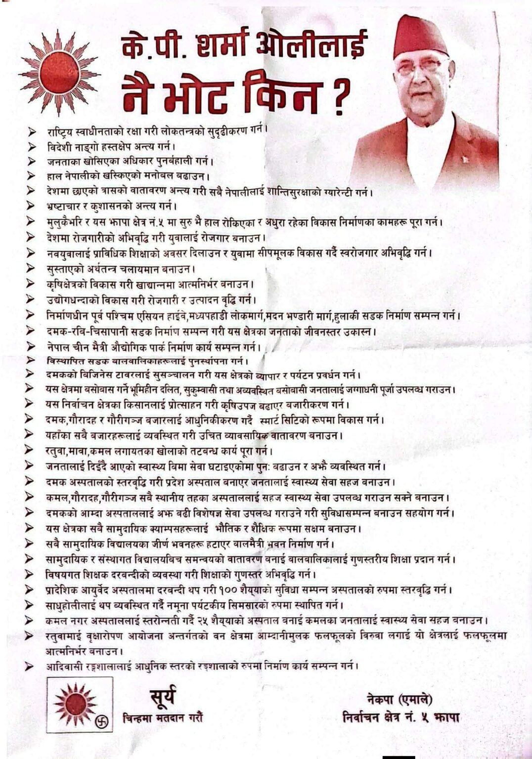केपी शर्मा ओलीलाई नै भोट किन ? शीर्षकमा जारी गरिएको अपिलमा जनताका खोसिएको अधिकार पुनर्बहालीका लागि पनि ओलीलाई जिताउनु पर्ने उल्लेख छ ।