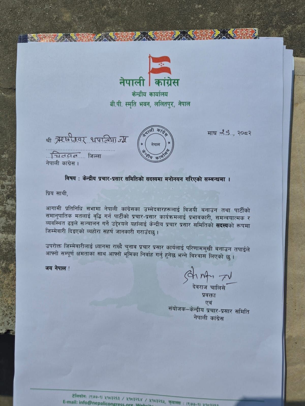 काठमाडौं । नेपाली कांग्रेसले पार्टीको केन्द्रीय प्रचार–प्रसार समिति सदस्यमा ऋषिश्वर थपलियालाई मनोनयन गरेको छ । चितवनका थपलियालाई काँग्रेसको केन्द्रीय कार्यलयले उक्त जिम्मेवारी दिएको हो ।